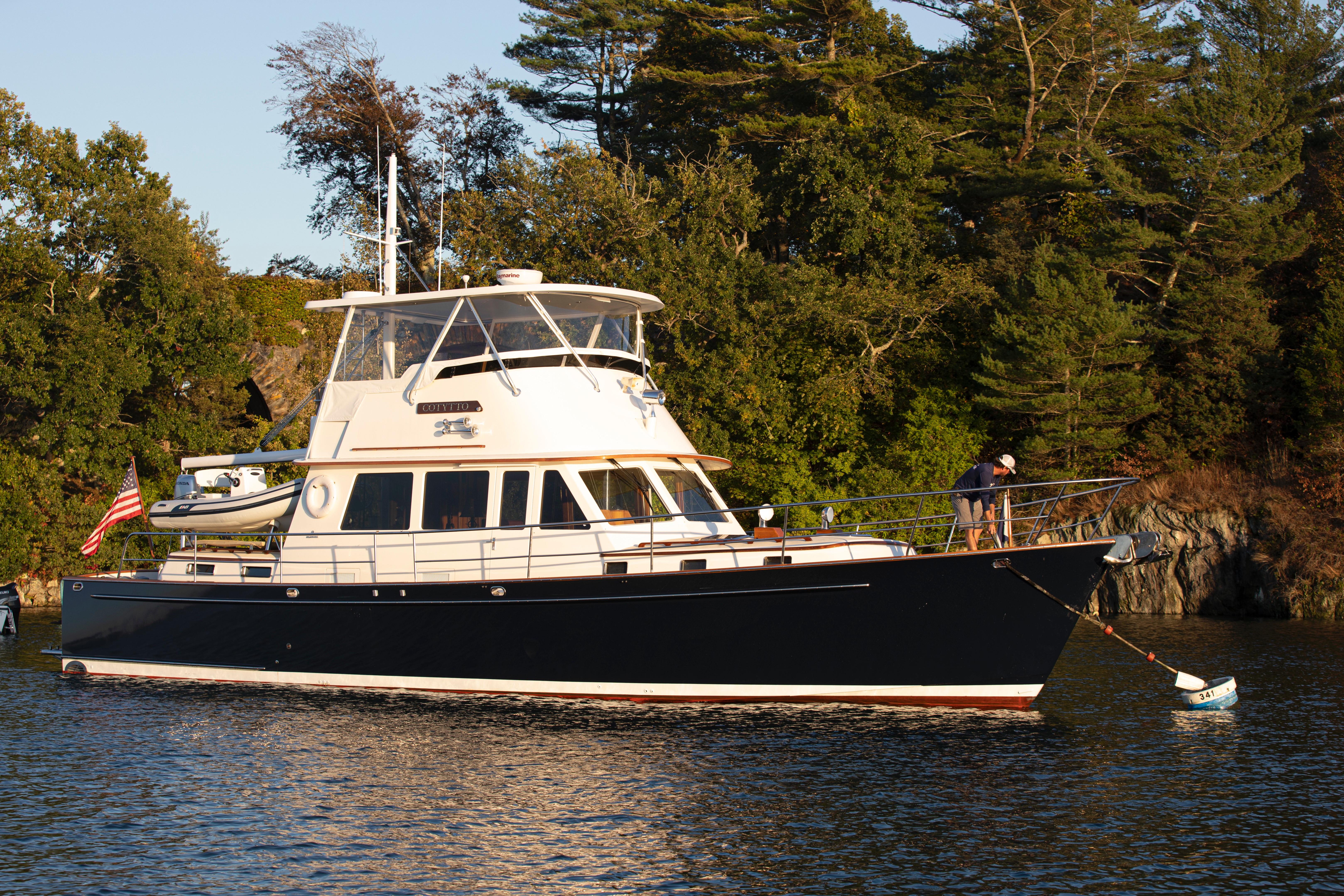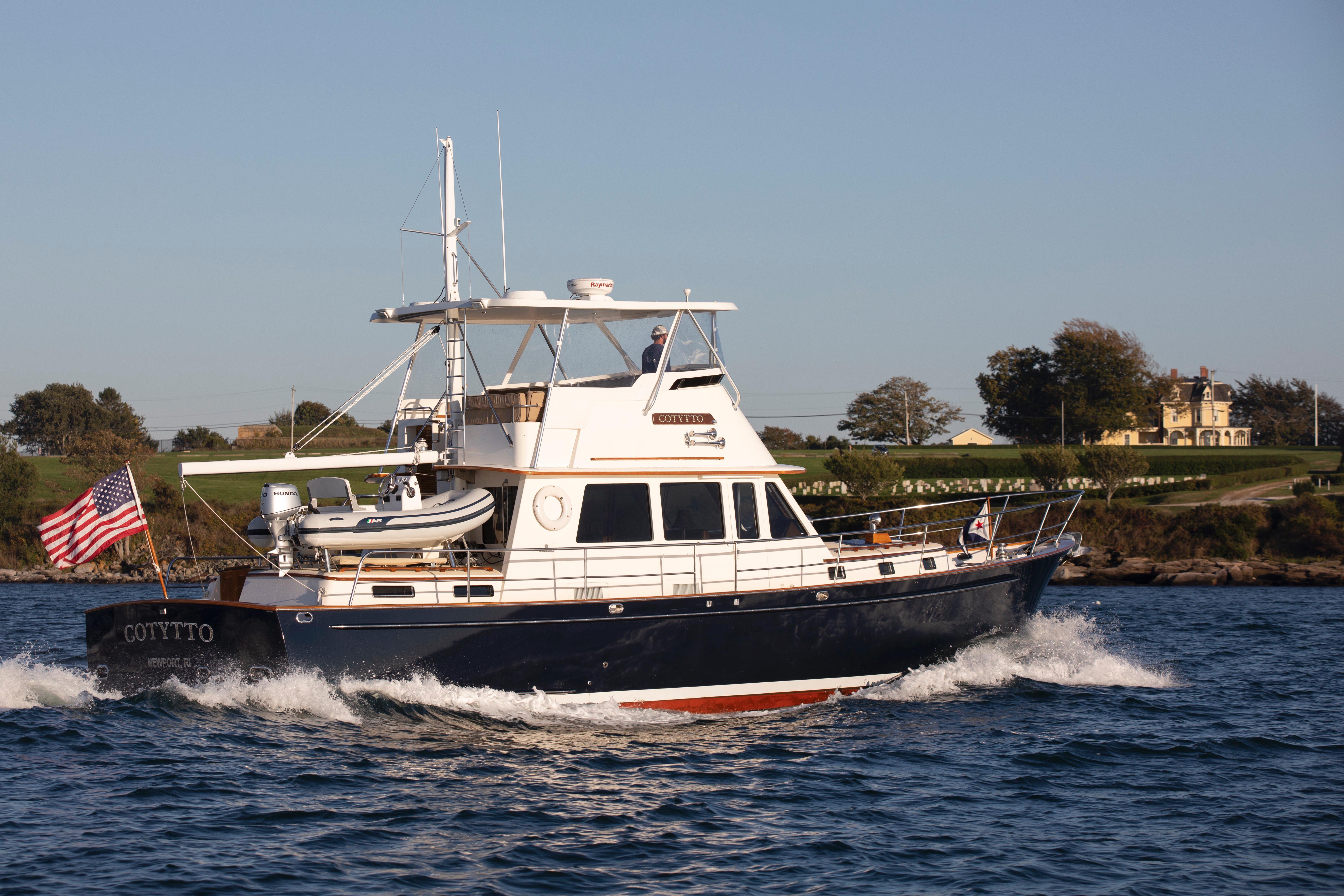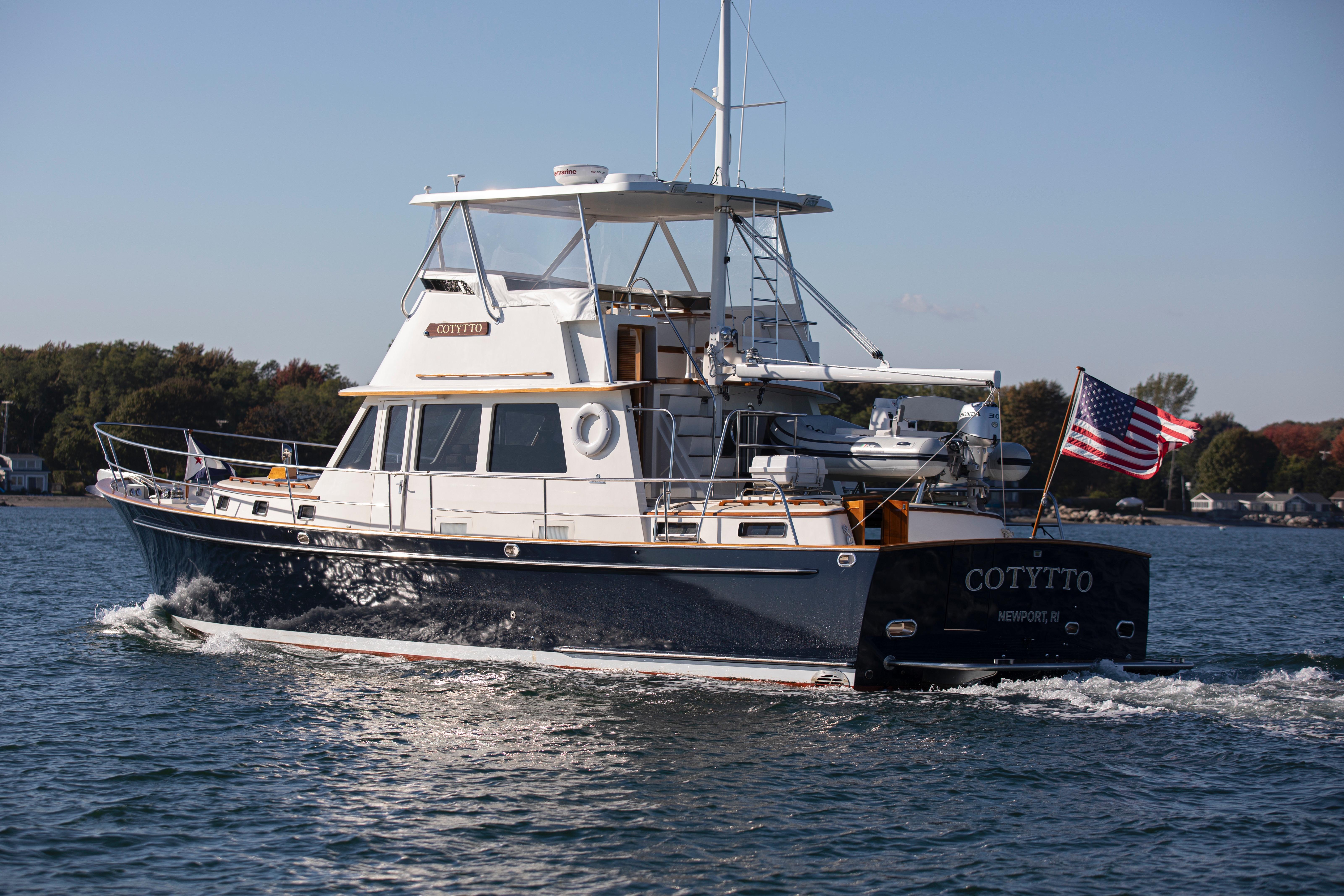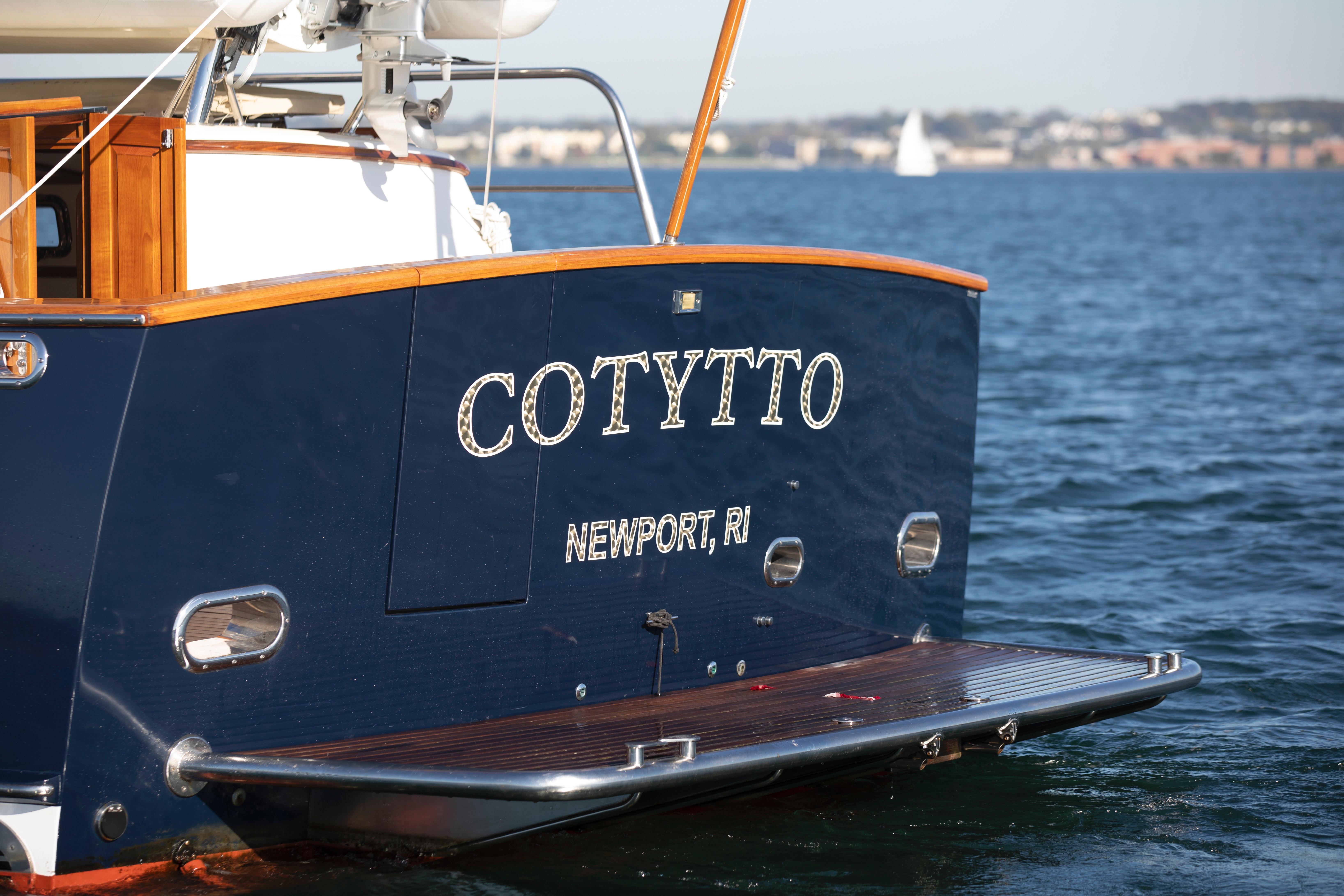 Cotytto is a spectacular three-stateroom, flybridge motor yacht from famed designer Mark Ellis, and custom builder Mark Bruckmann. She is a serious machine, with a deep V hull configuration and high bow. She has strong CAT diesel engines that provide fast all-weather performance and range, along with systems that are typically found in a much larger yacht. She is sea-kindly, agile at all speeds, quiet and perfect for her intended purpose of coastal cruising with a crew of four adults.