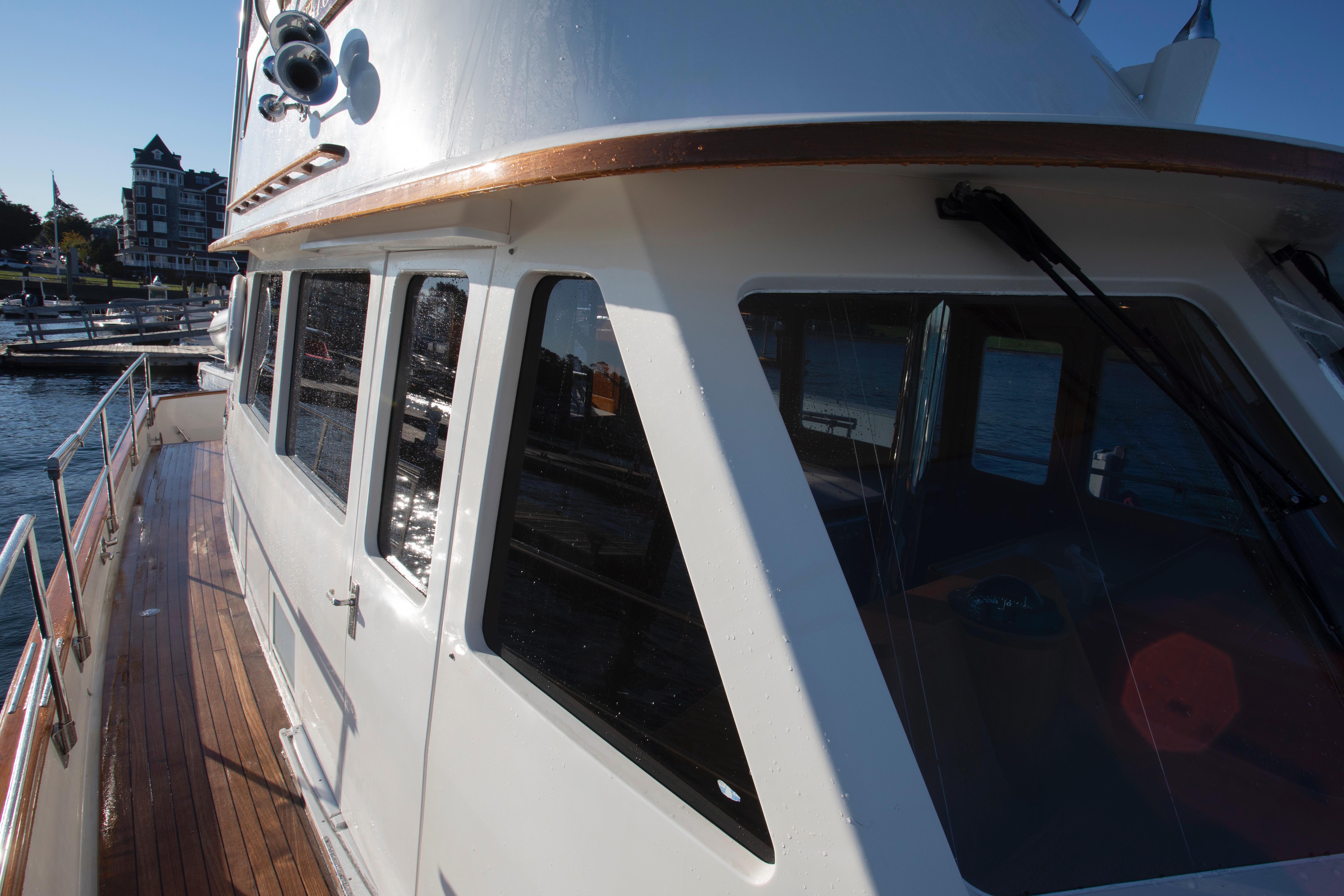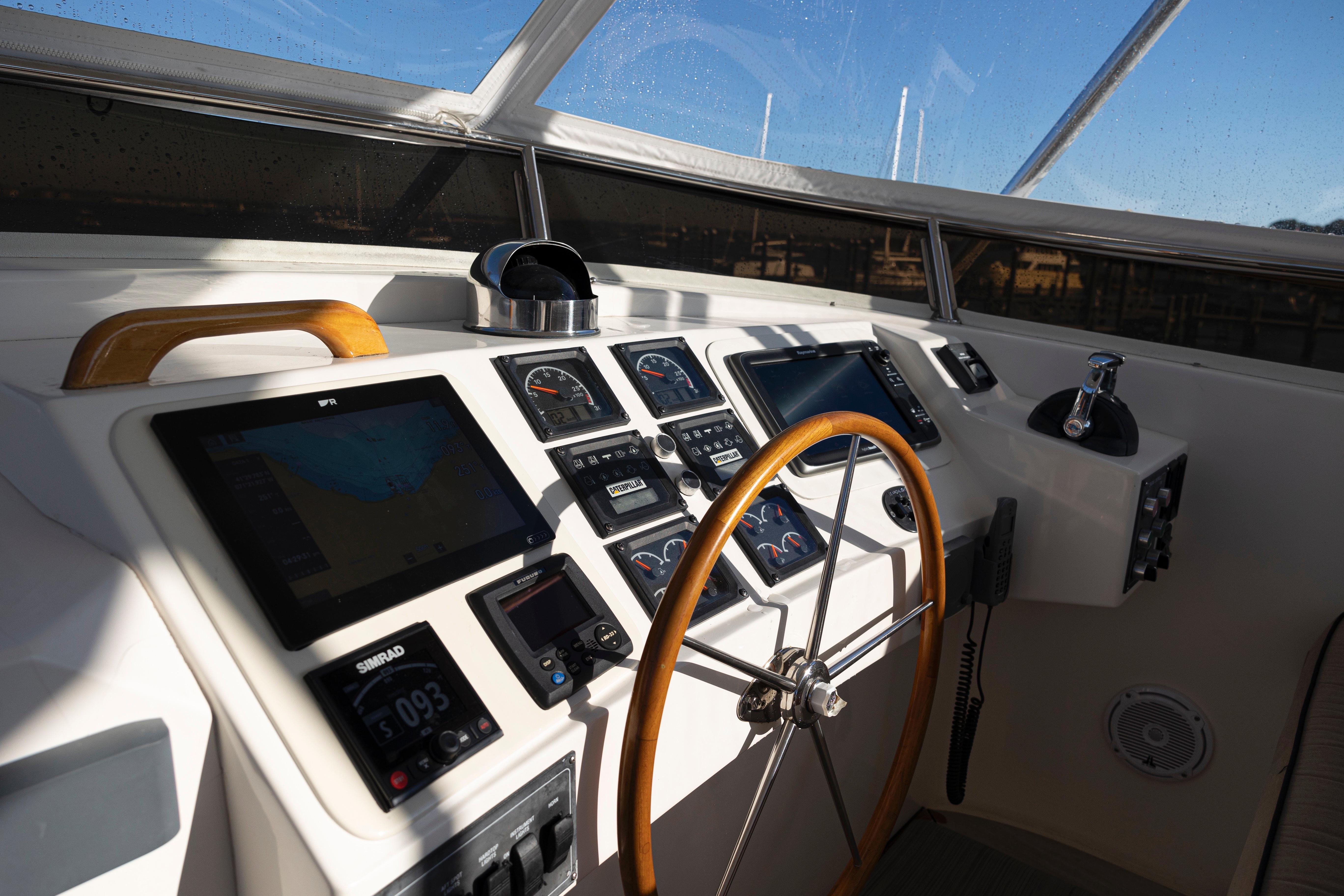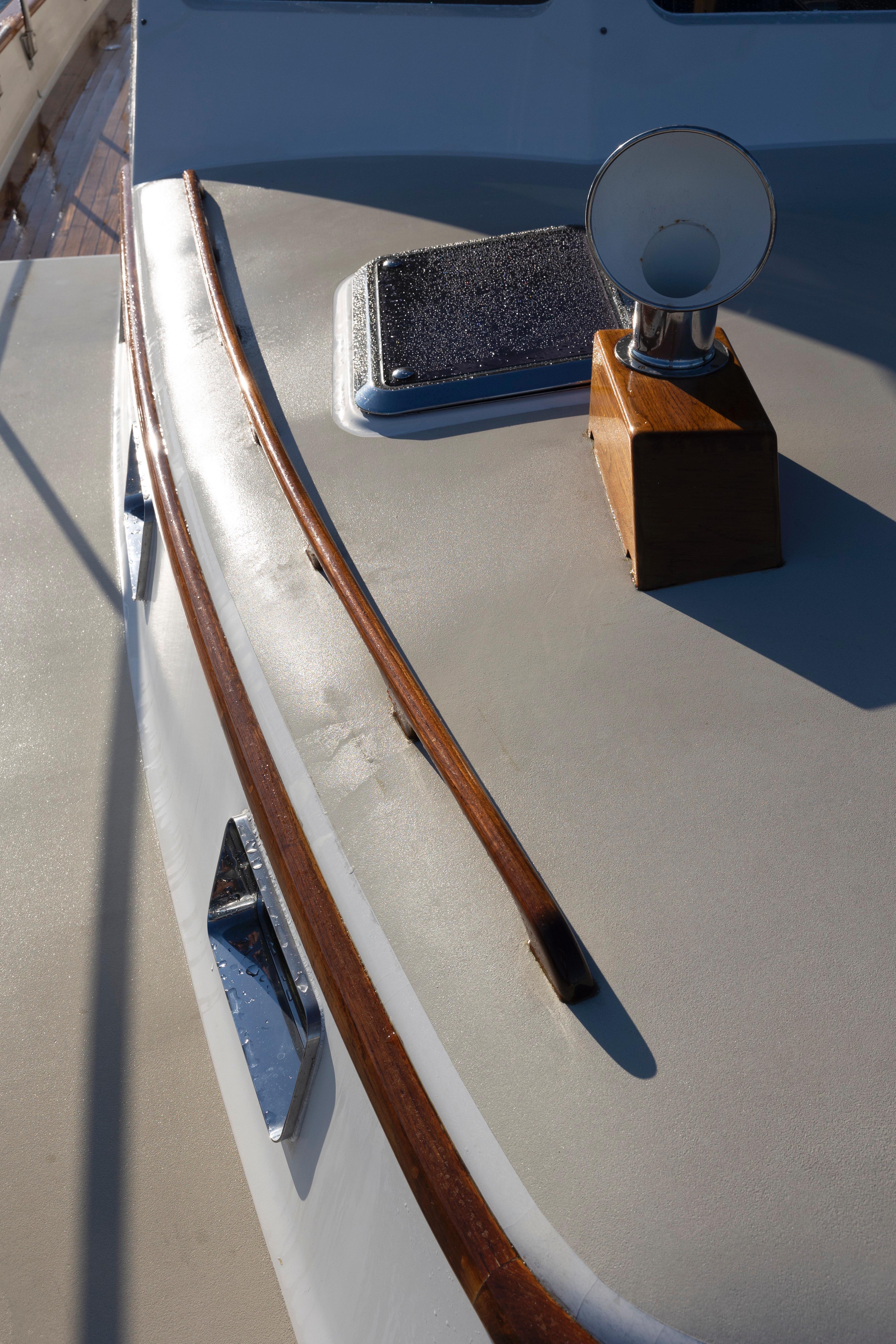 The hull laminate is first class with the use of Vinylester resin throughout. Core-cell foam core has been added for stiffness as well as sound and thermal insulation. The deck also utilizes core-cell foam. The hull-to-deck joint is bonded and fastened every four inches. There are fiberglass rub and hip strakes molded to the hull fitted with stainless strikers. Oversized full pipe stainless steel swim platform structure with a teak inlay, cleats, and folding ladder. Teak soles on aft cockpit, side decks, and flybridge. The foredeck, forward housetop, and aft housetop sections are Desert Sand Awlgrip sprayed non-skid. Custom full-height stainless bow and side rails run the entire length of the boat til the aft cockpit with boarding access to port and starboard. Varnished teak cap rail and housetop accent trim.