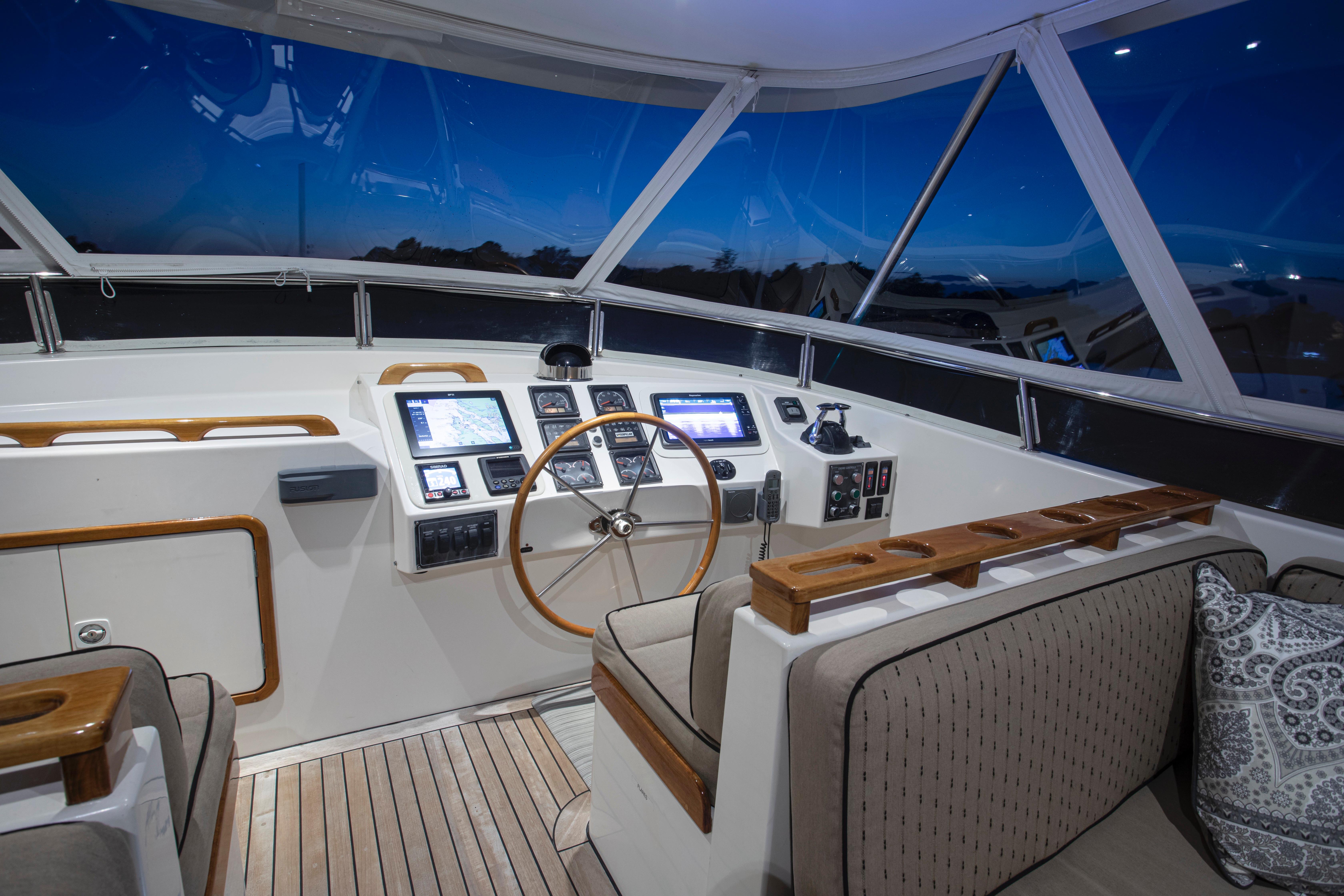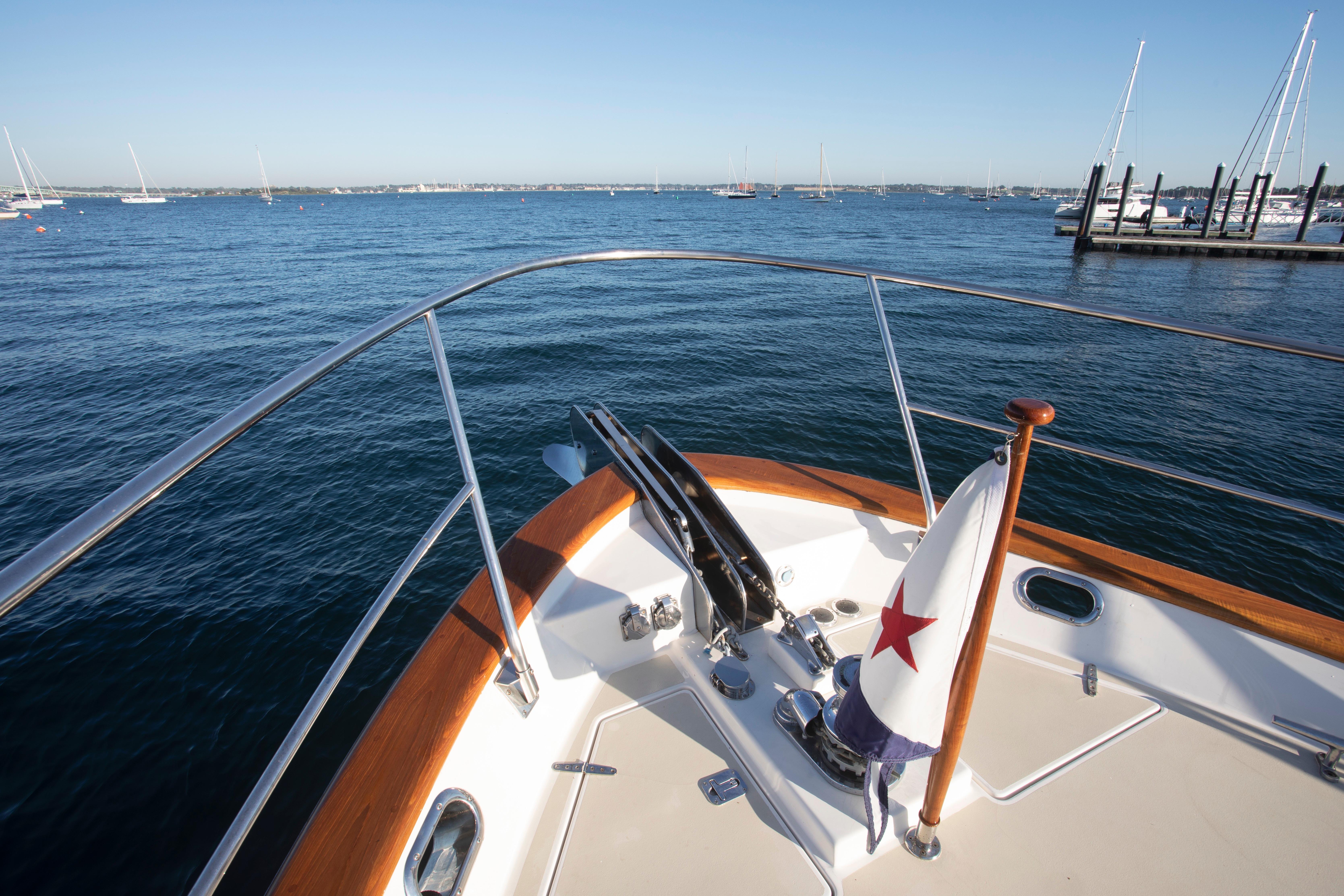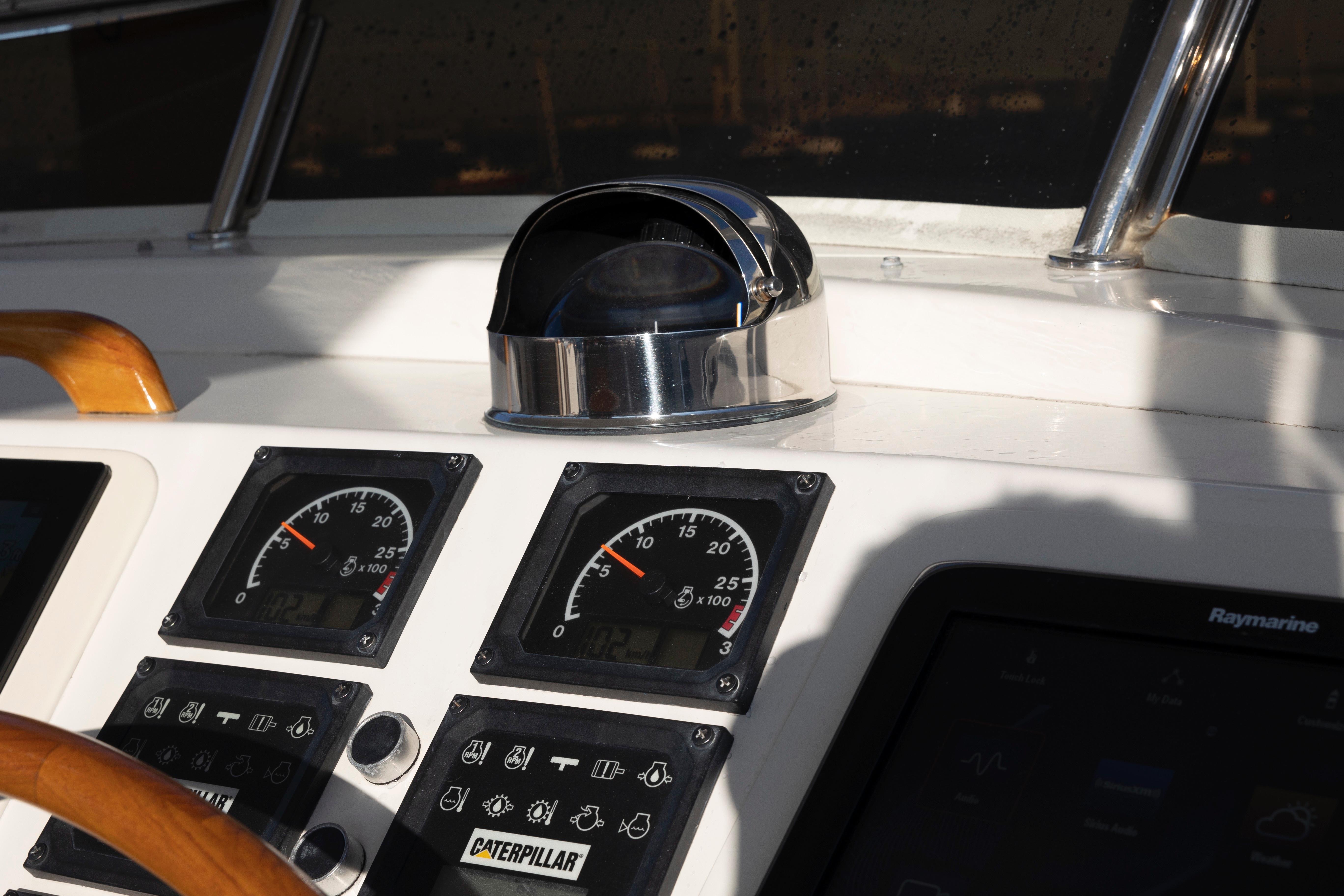 The hull laminate is first class with the use of Vinylester resin throughout. Core-cell foam core has been added for stiffness as well as sound and thermal insulation. The deck also utilizes core-cell foam. The hull-to-deck joint is bonded and fastened every four inches. There are fiberglass rub and hip strakes molded to the hull fitted with stainless strikers. Oversized full pipe stainless steel swim platform structure with a teak inlay, cleats, and folding ladder. Teak soles on aft cockpit, side decks, and flybridge. The foredeck, forward housetop, and aft housetop sections are Desert Sand Awlgrip sprayed non-skid. Custom full-height stainless bow and side rails run the entire length of the boat til the aft cockpit with boarding access to port and starboard. Varnished teak cap rail and housetop accent trim.