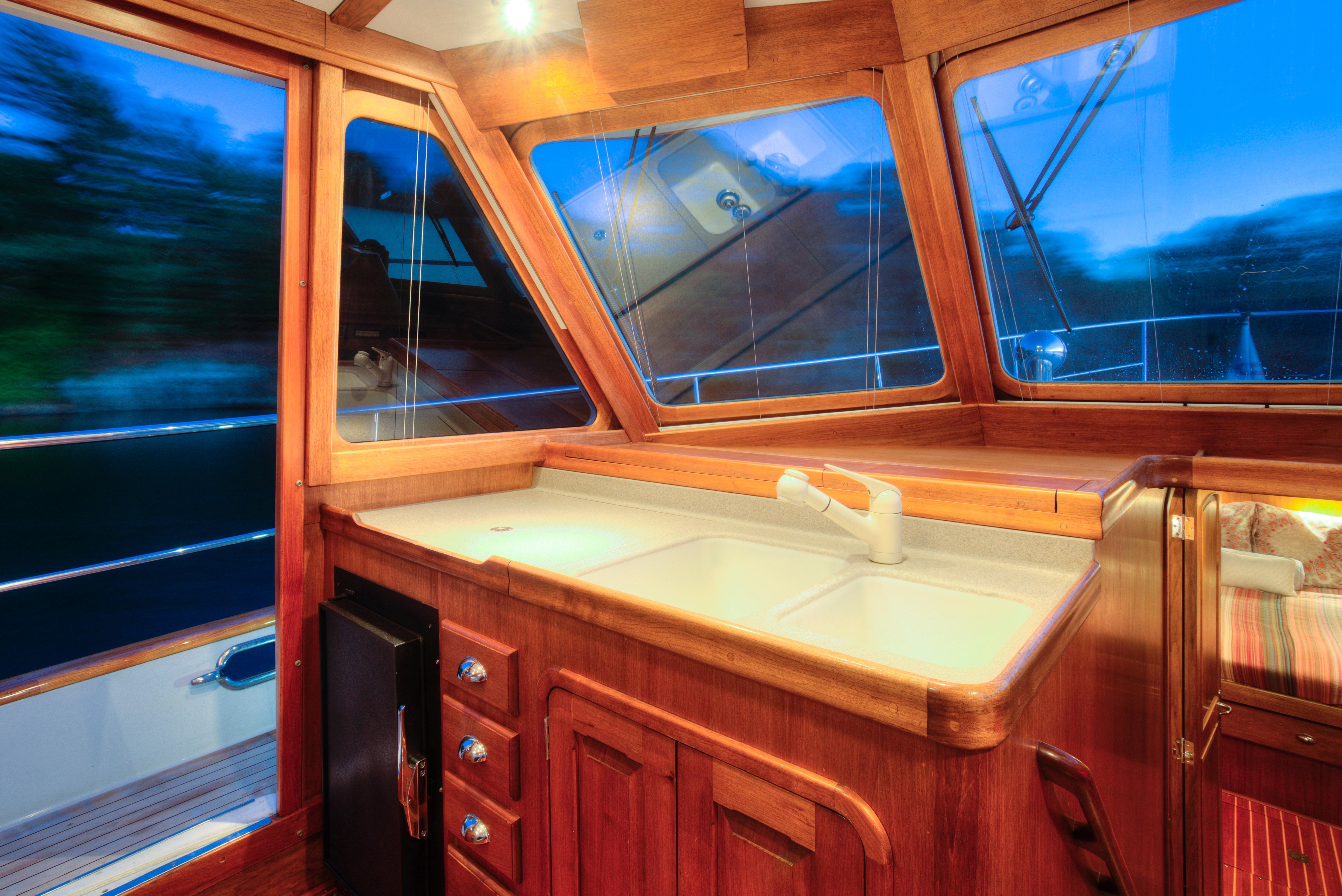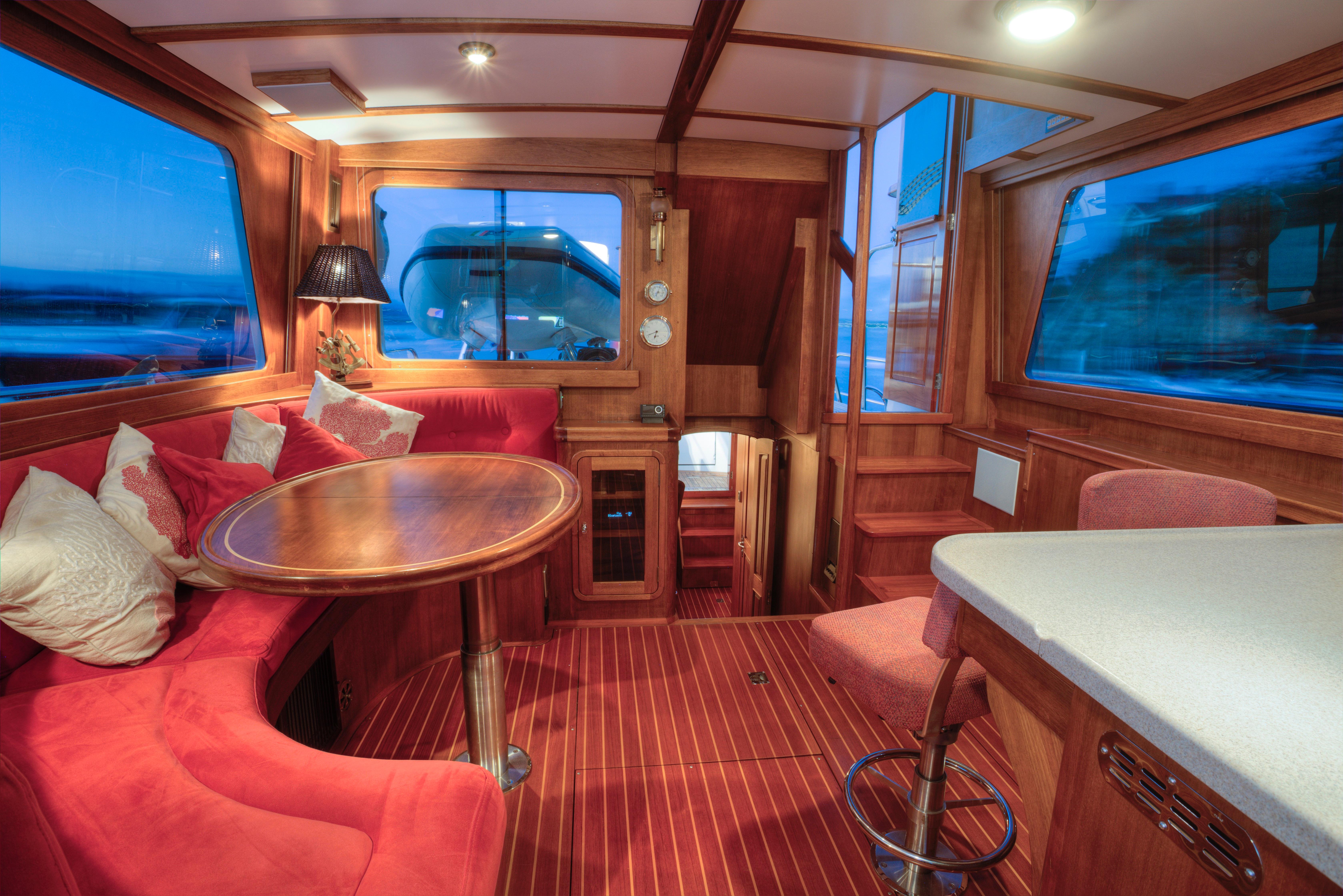 The flybridge is accessed from the stairs on the port side aft. Generous seating for 8 guests comfortably with easy walk-up steps and railings for safety in all conditions. Views of the bow and stern are virtually unobstructed. There are varnished drink and storage holders to port and starboard, grab rails and courtesy lights. A varnished teak dinette table drops flush with the starboard settee to create a lounge area. Ample storage is provided under each bench and by two large lockers under the helm.