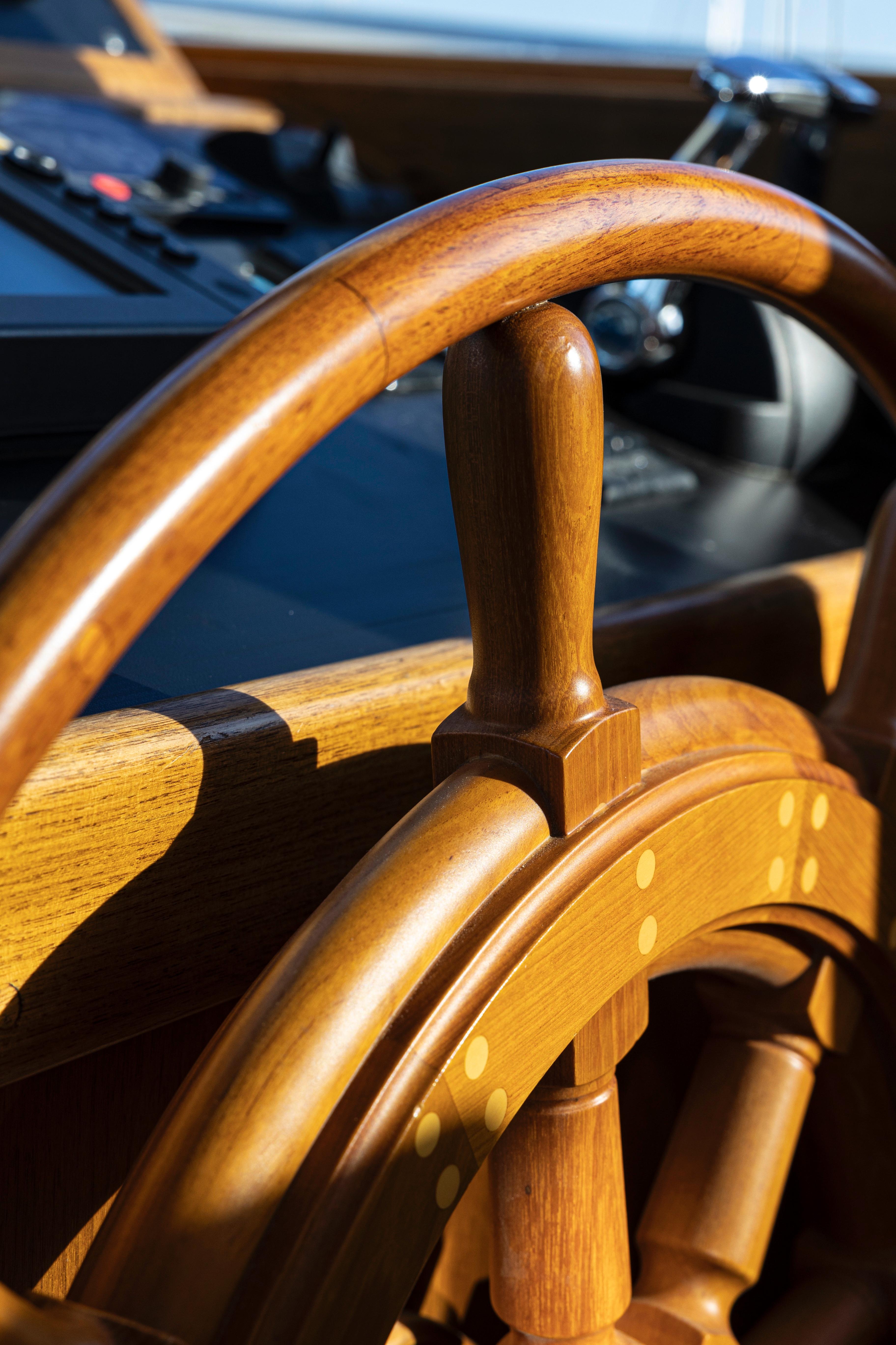 Cotytto has a luxurious and innovative three-stateroom layout offering comfortable accommodations for all guests. The entire interior features matched grain butternut paneling finished in hand-rubbed satin appointed with a high gloss teak and holly sole. There is a remarkable flow between individual living and sleeping areas, offering far greater privacy due to separation between the owner's stateroom, crew, and guest areas allowing all aboard unencumbered access to the salon.