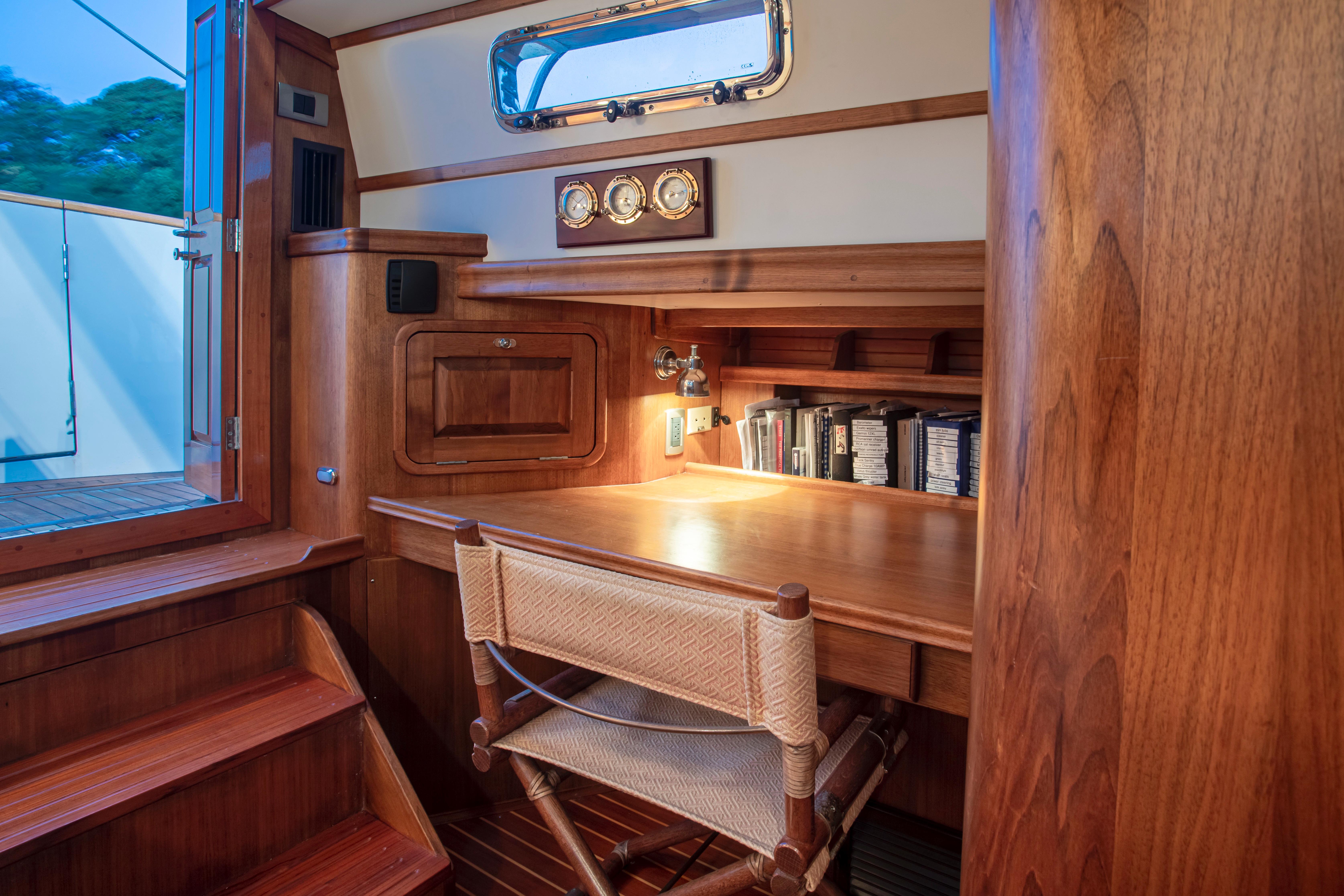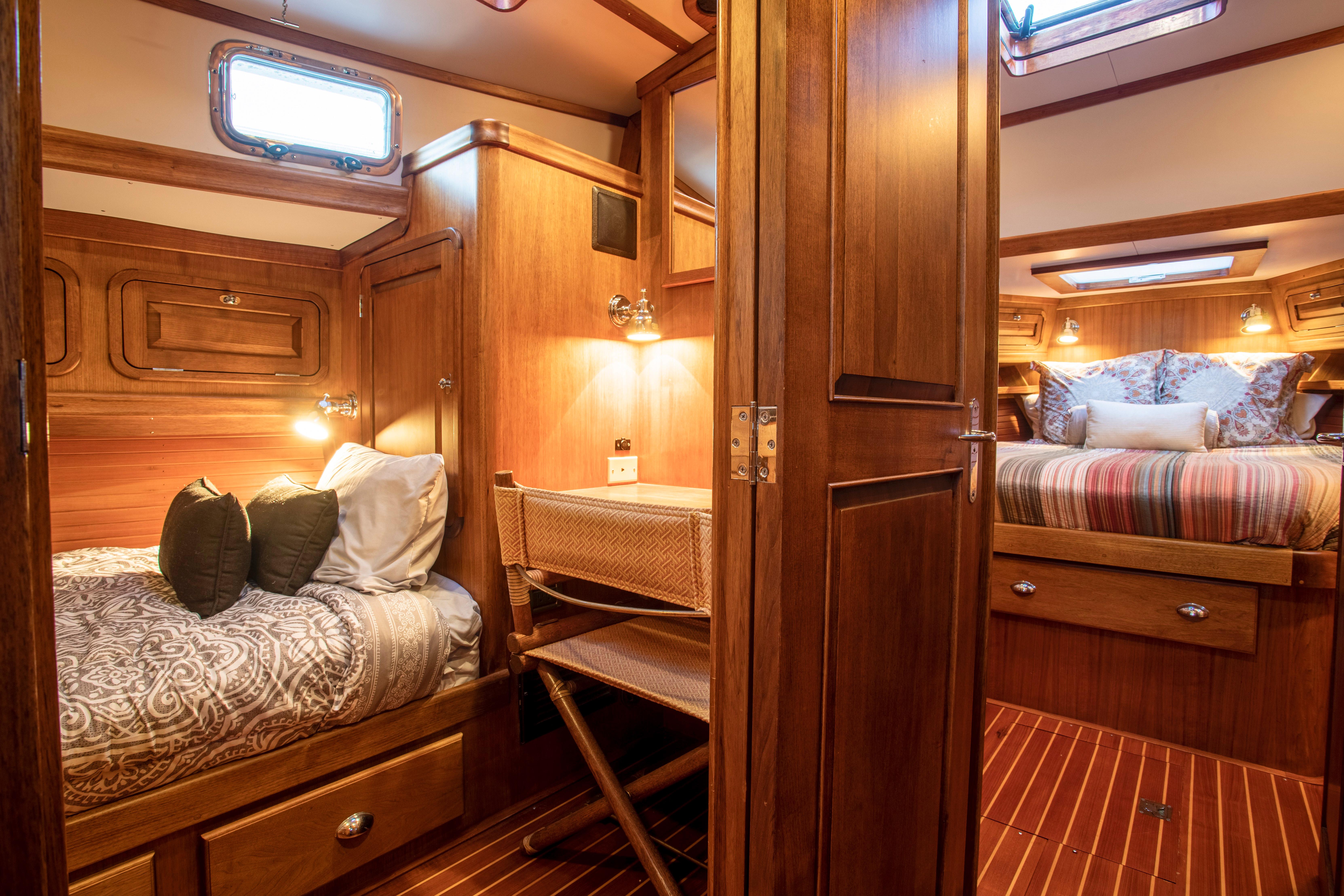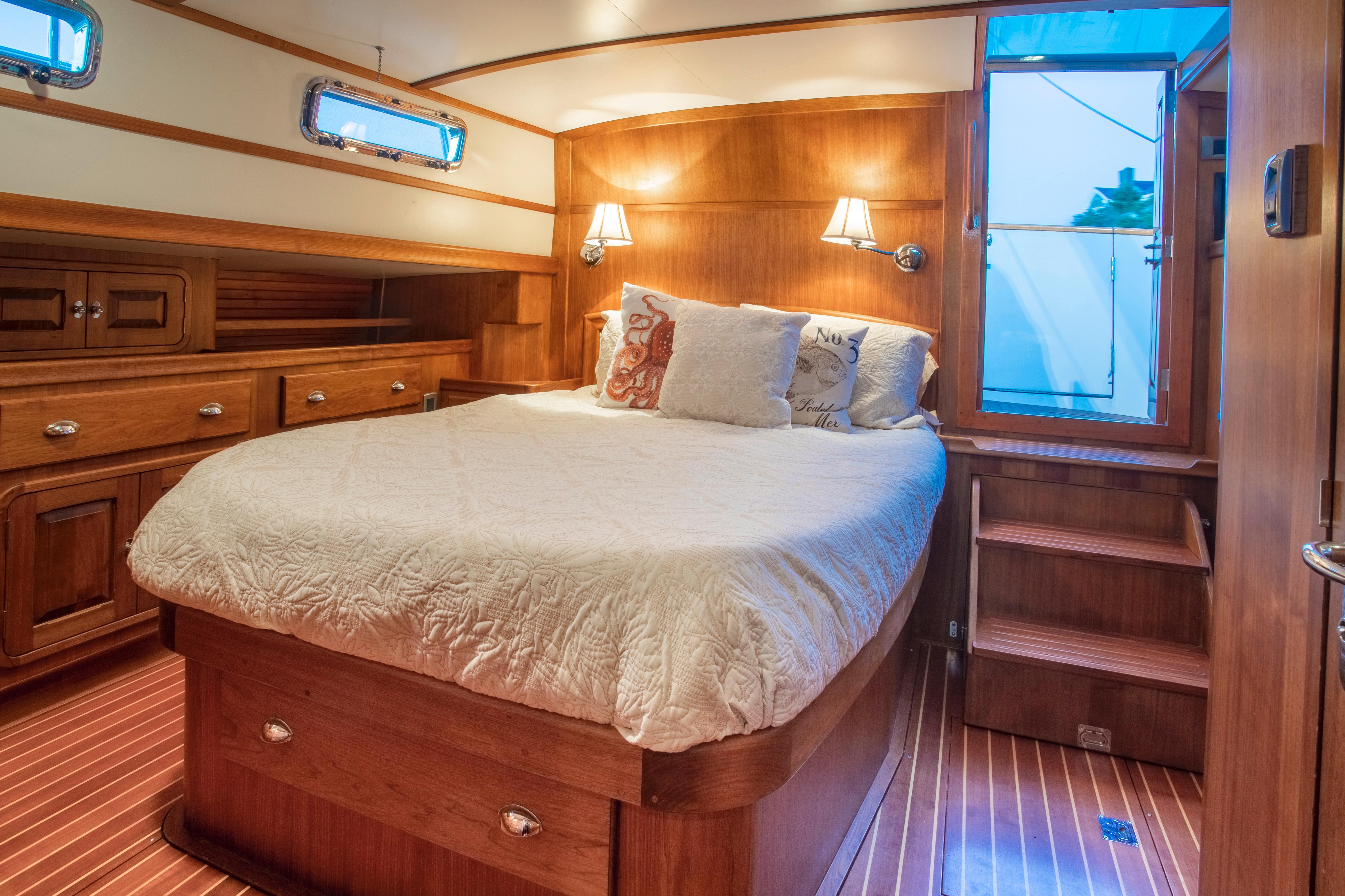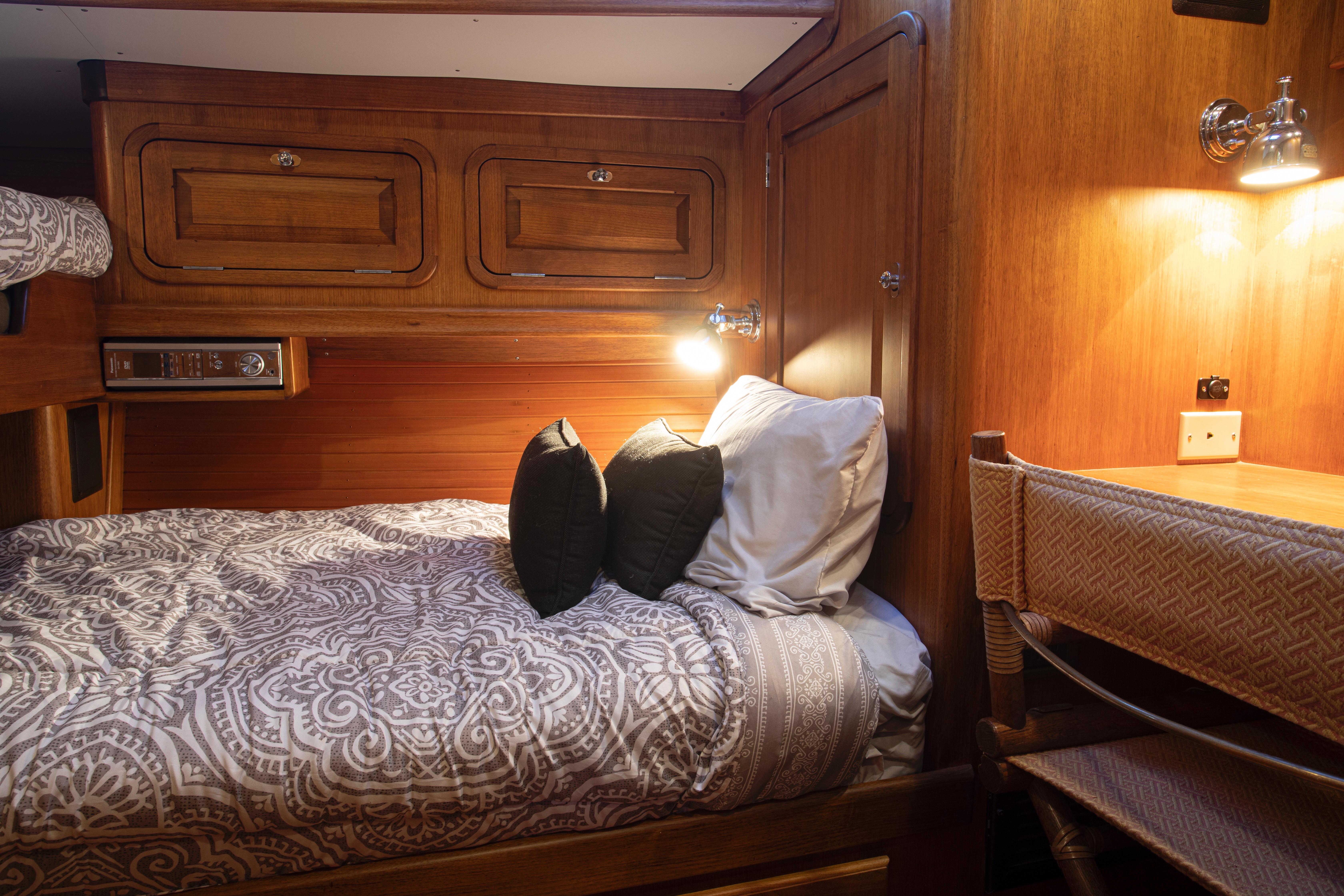 Aft of the salon is the Aft Cabin, which has generous room due to the trunk cabin of the yacht. There is plentiful counter space, a centerline queen bed, and enormous amounts of storage in drawers and lockers. A working desk outboard and head to the port side. This head also features an electric toilet and a separate stall shower. Lastly, the aft cabin has an exit to the cockpit.