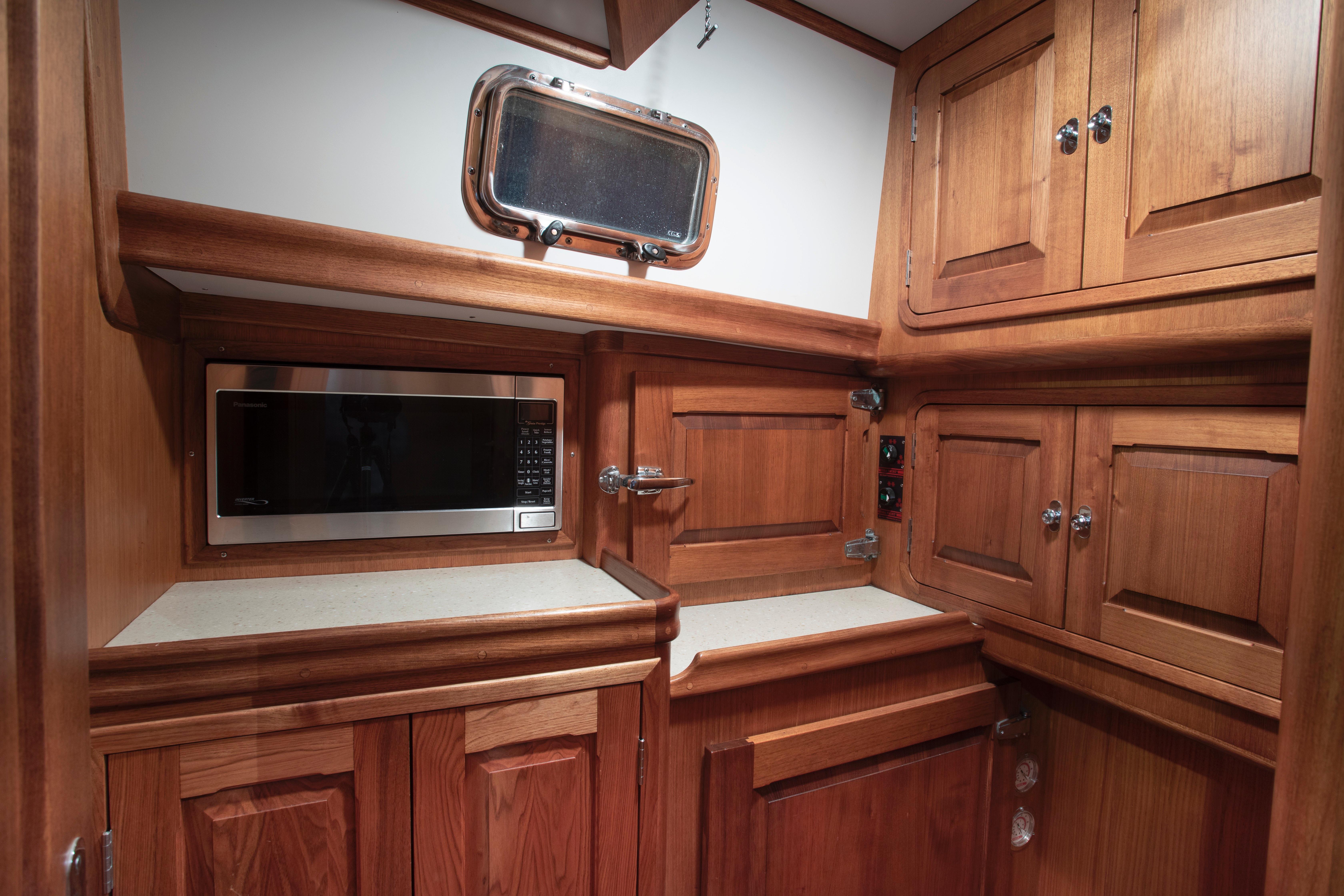 Next aft to starboard is a unique chef's Pantry with shelving, drawers, and extra storage lockers that could accommodate any trip’s food provisions. Seafrost-holding plate refrigeration and freezer provide dependable cold storage.