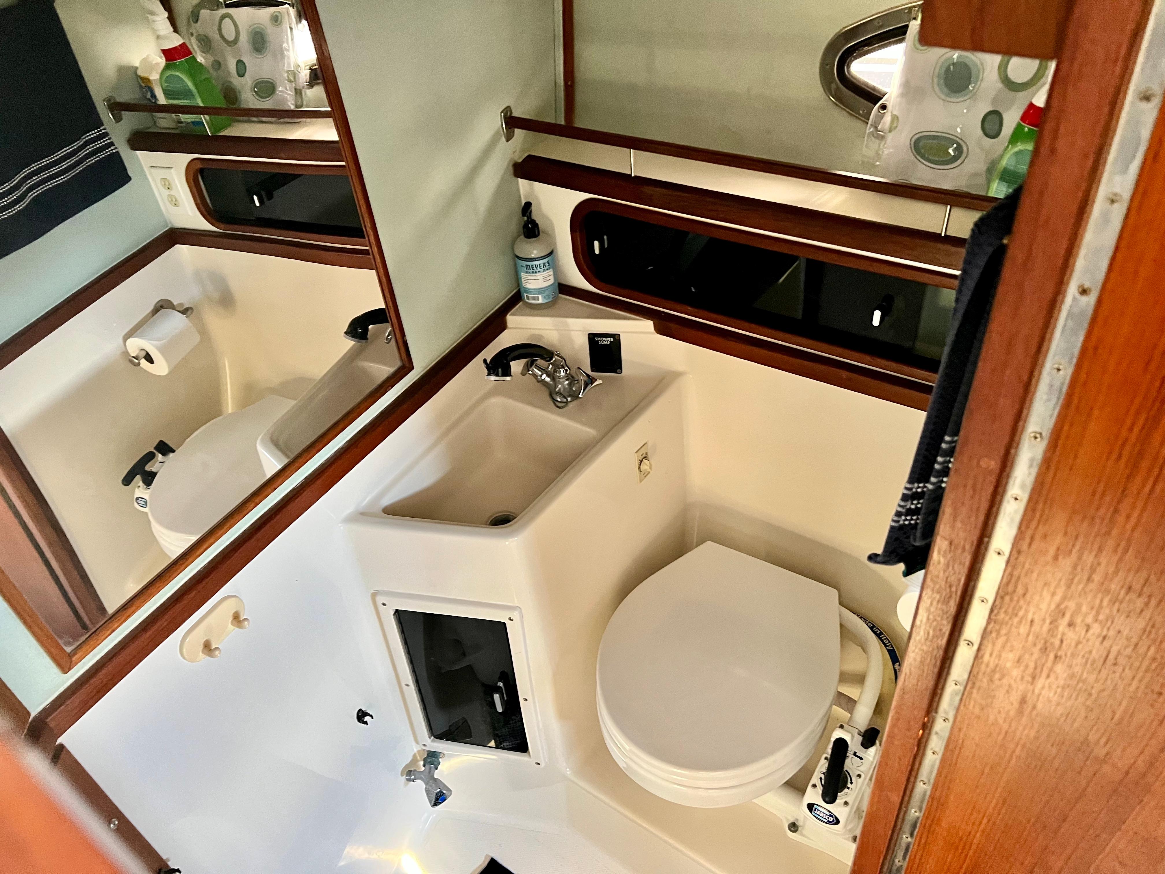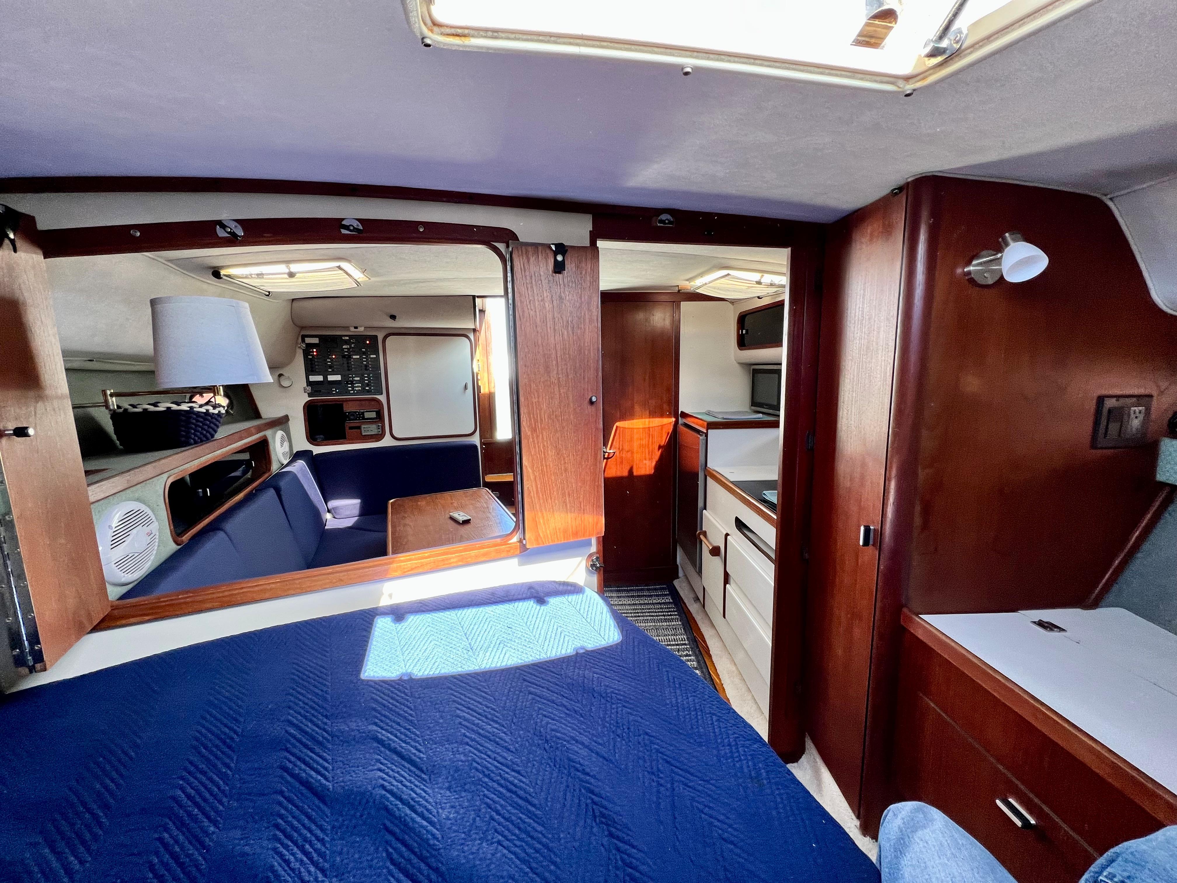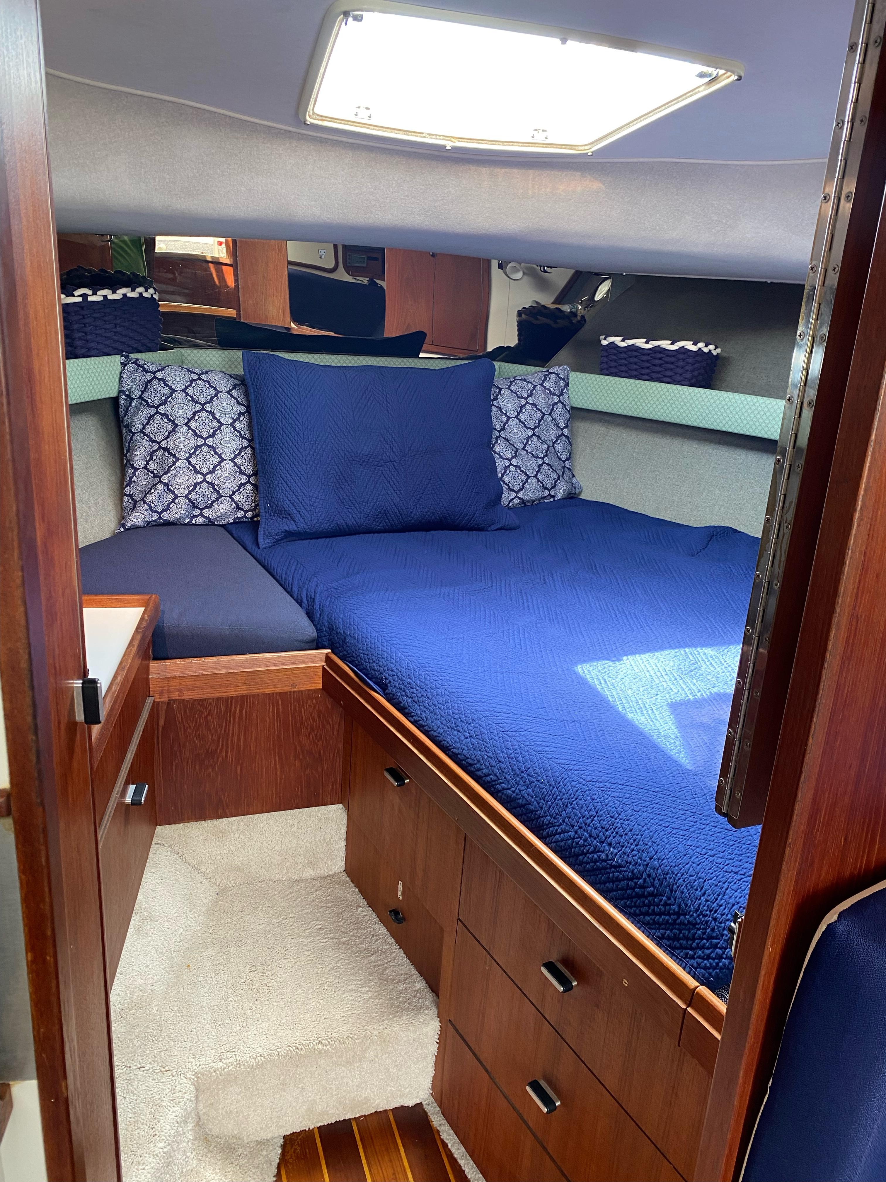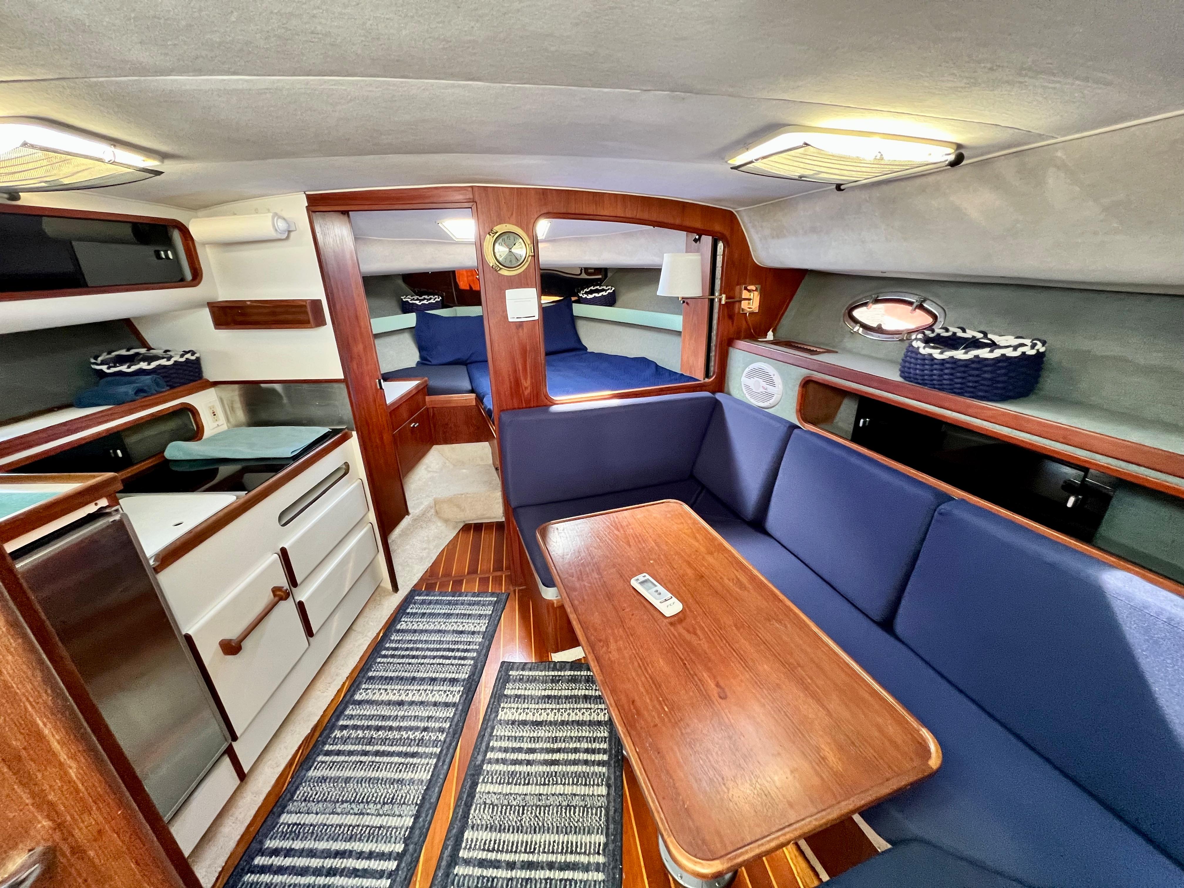 Stepping down into the salon is a linear galley to the portside with a head aft of the cabinetry. To starboard is the dinette which drops to form a double berth. There is storage overhead. The v berth is forward, with an opening door and mirror that can close to create privacy.