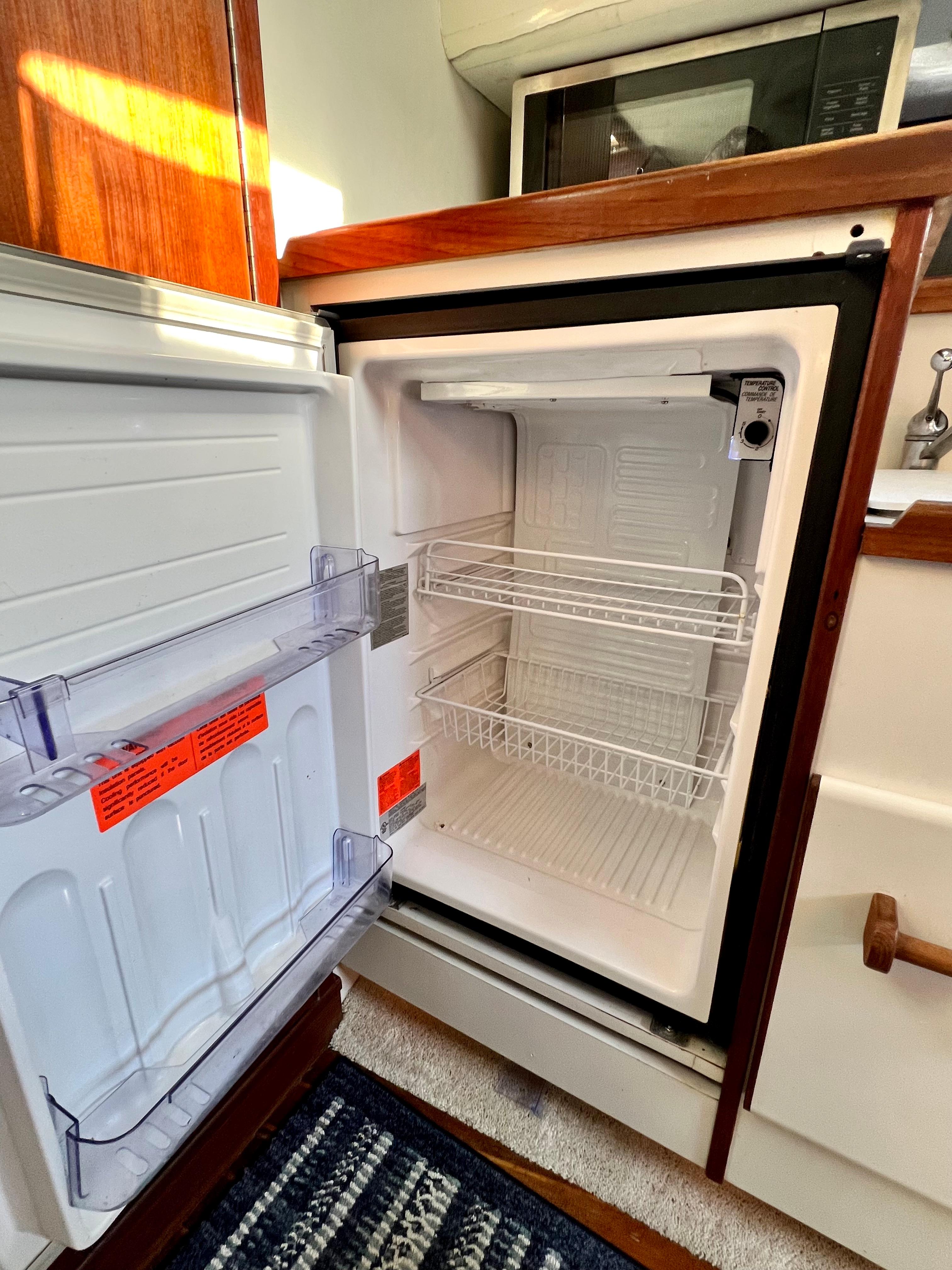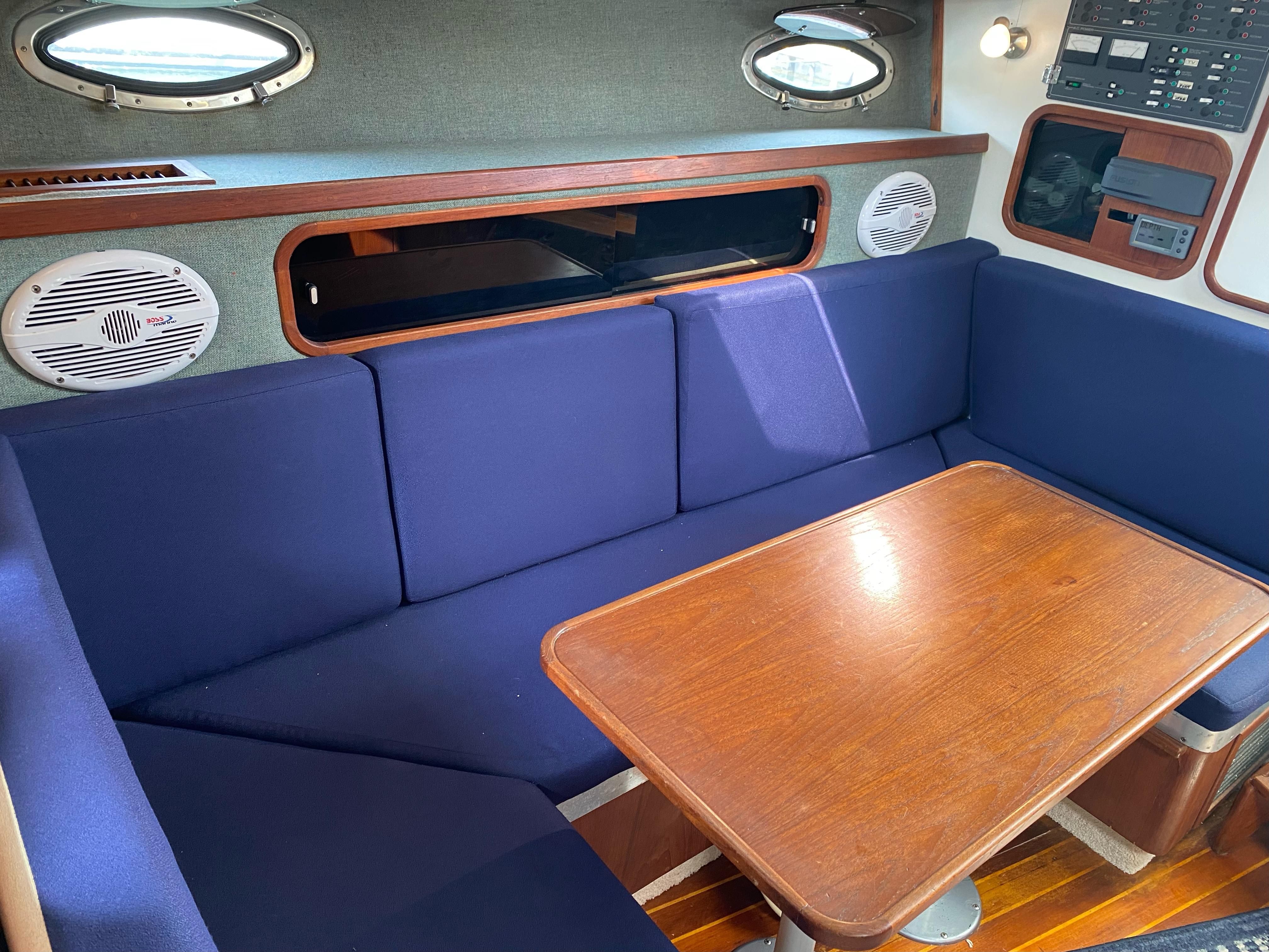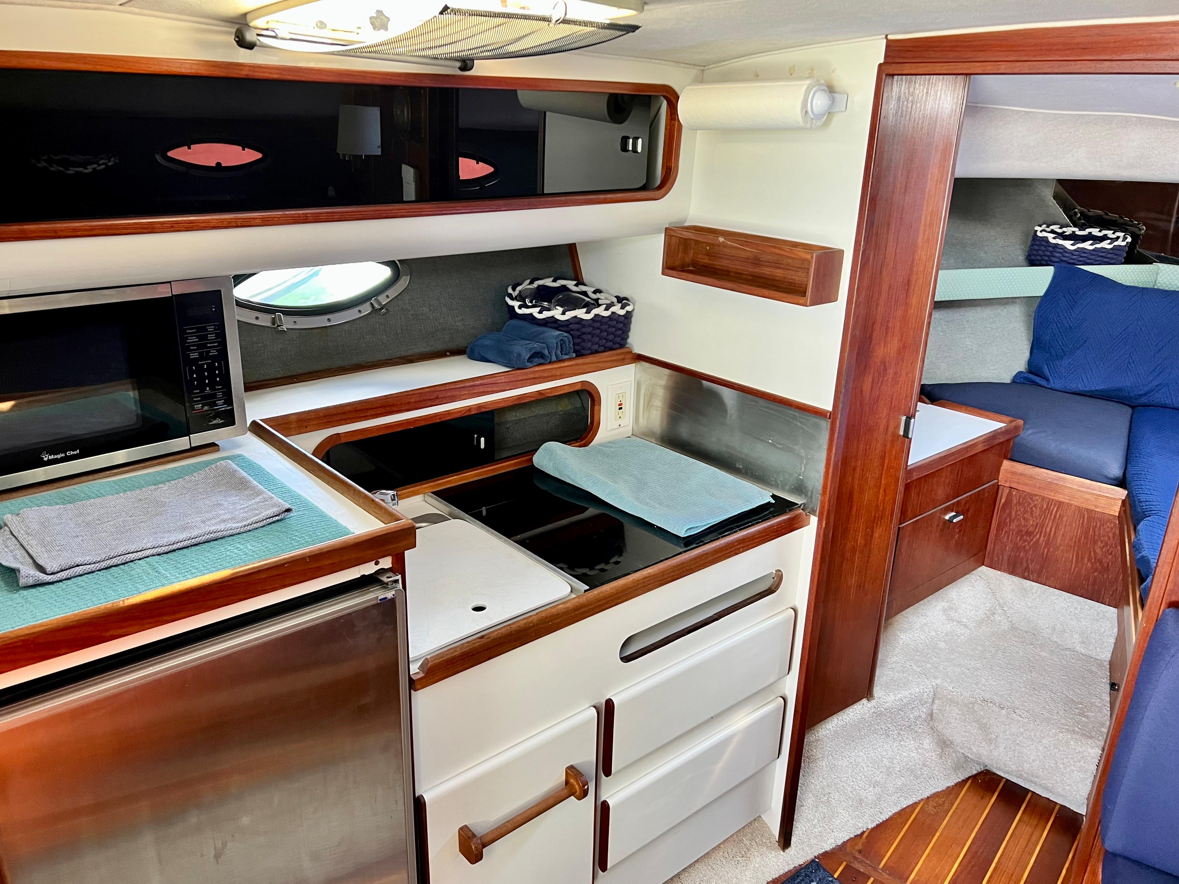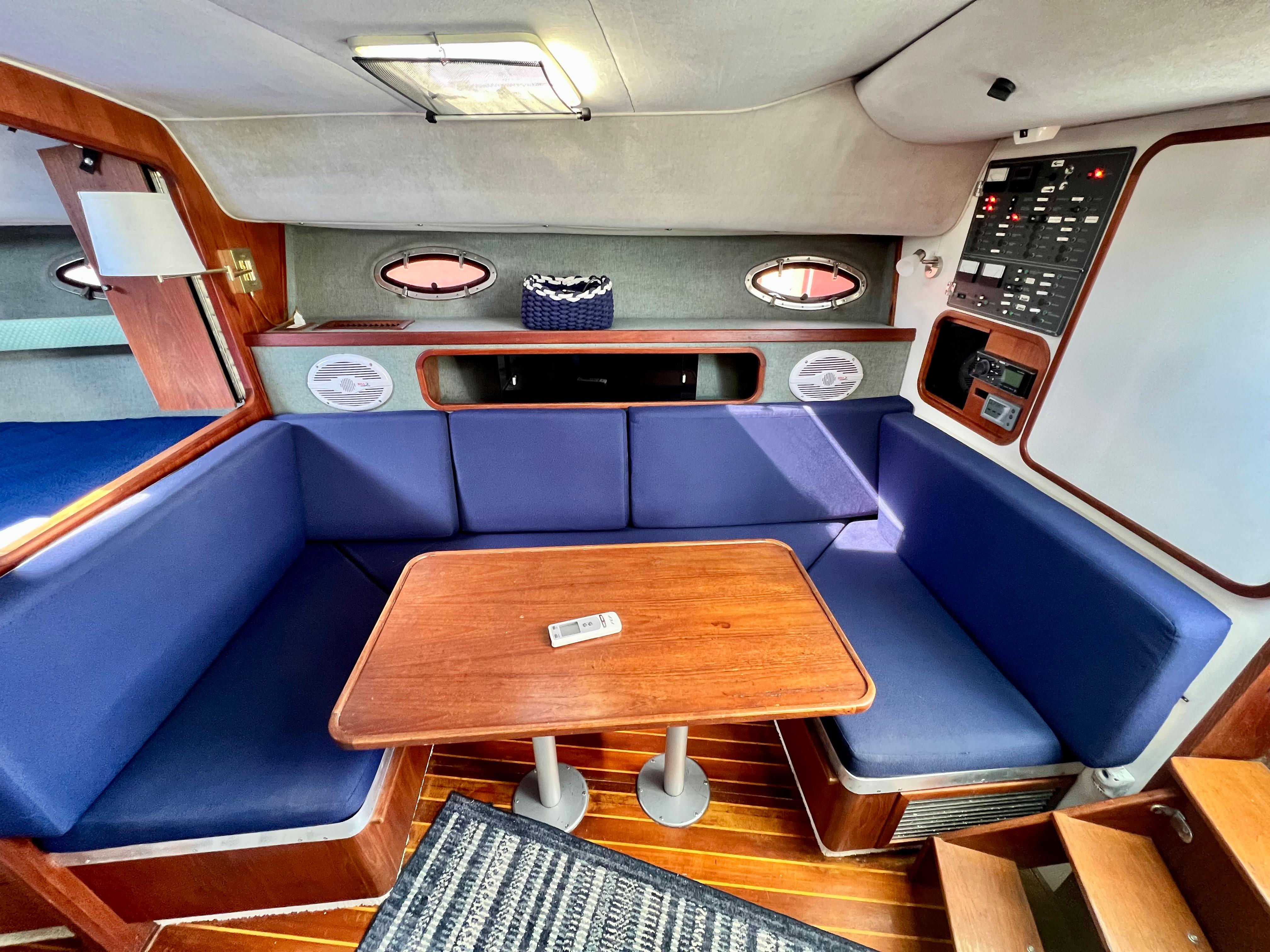 Stepping down into the salon is a linear galley to the portside with a head aft of the cabinetry. To starboard is the dinette which drops to form a double berth. There is storage overhead. The v berth is forward, with an opening door and mirror that can close to create privacy.