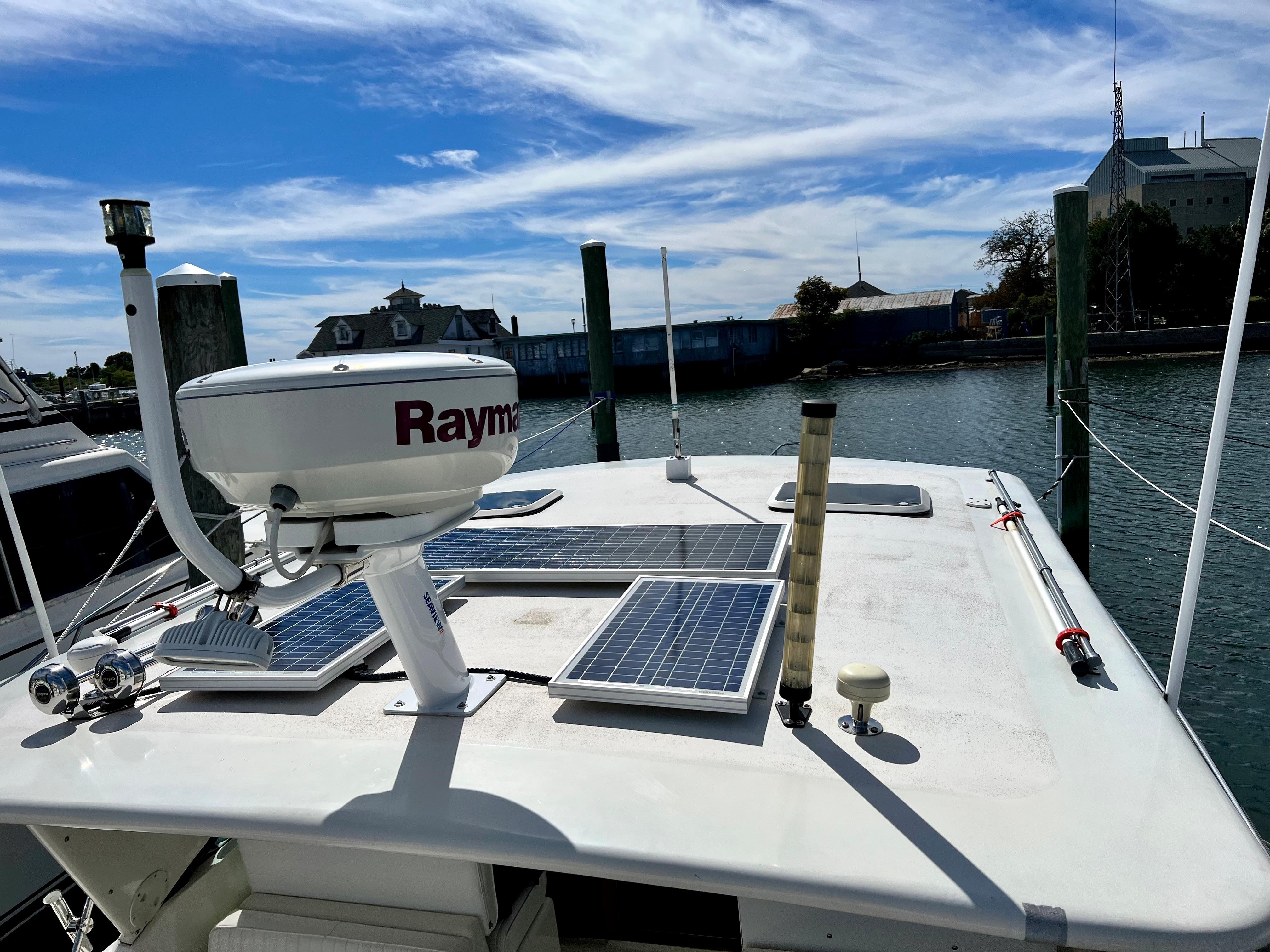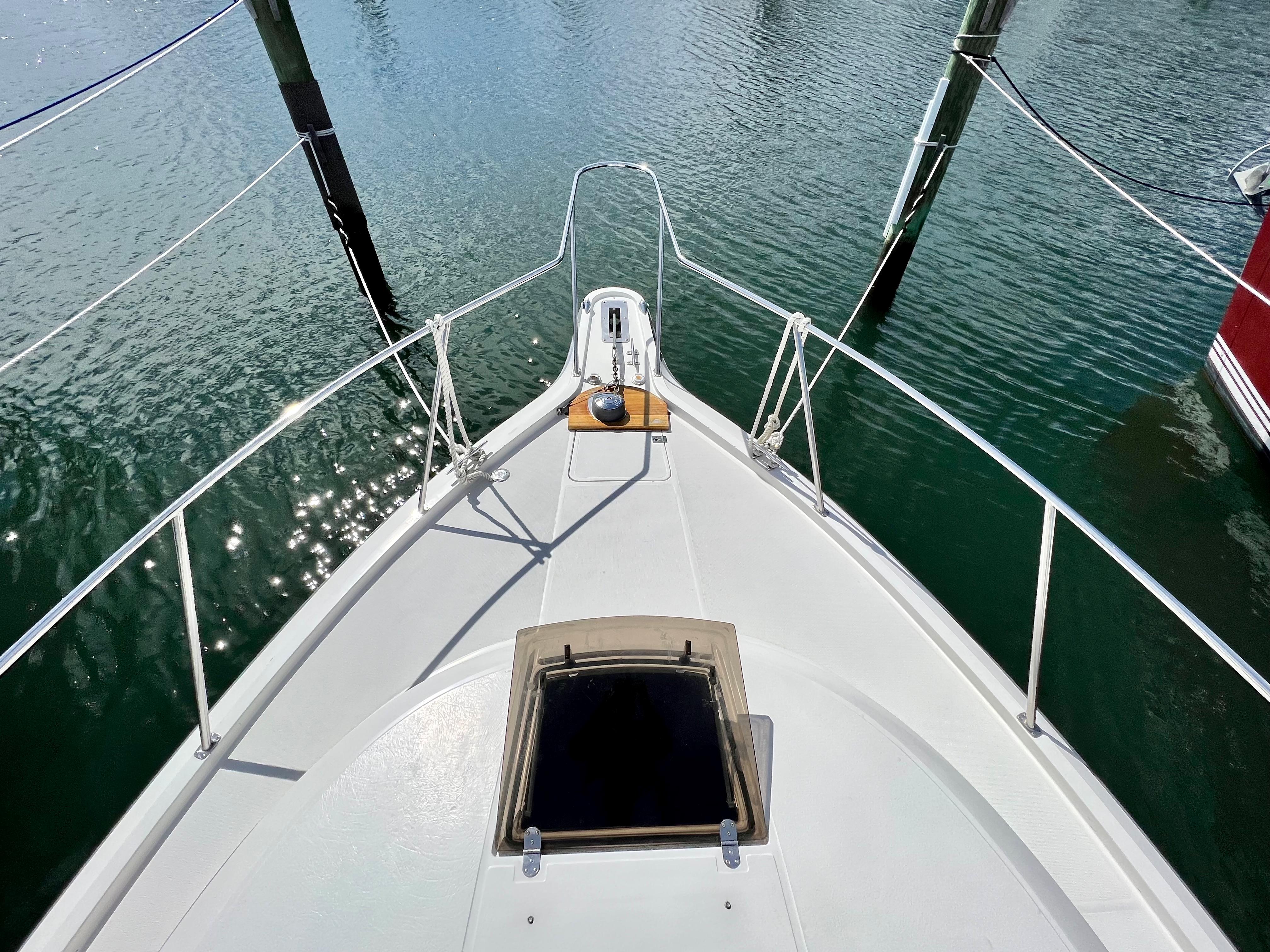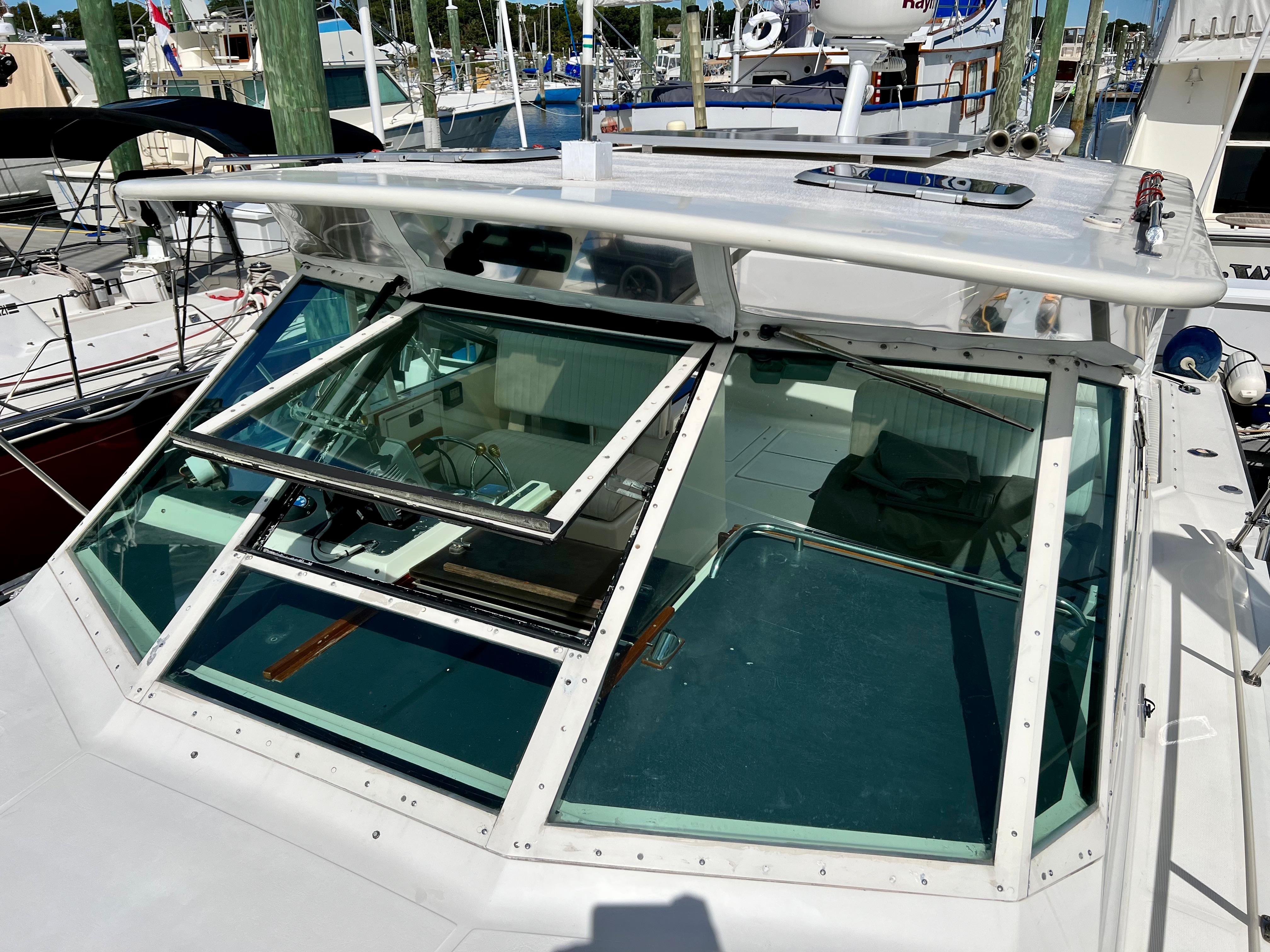 Hand laid FRP & coring in hull sides and deck using premium resin. Tiara custom diamond-patterned non-skid deck and cockpit surfaces. Engine room ventilation is molded on the hull side. Molded fiberglass bow pulpit and swim platform with teak inlays. One piece welded 316L 1” bow rail. Black rub rail with stainless striker runs the length of the hull.