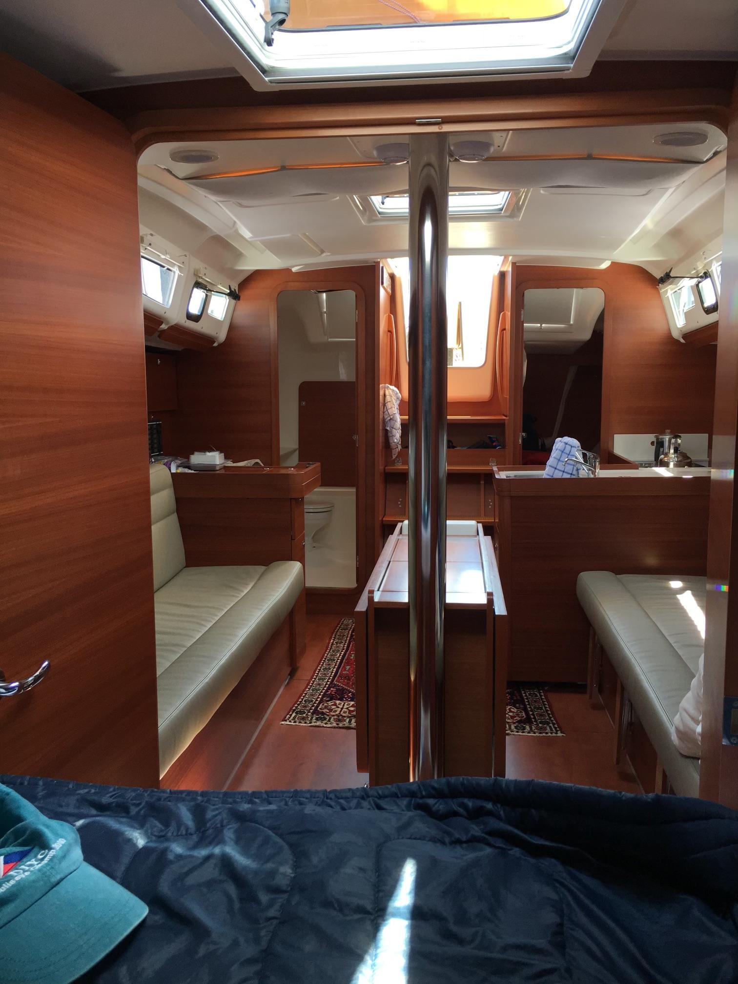 Starting forward you find the forward cabin. This cabin has double doors in the bulkhead that allows for a more open feel when the cabin is not in use. Aft of the forward cabin are two straight settees that surround the salon dining table. The L-shaped galley can be found just aft of the port settee and opposite to the starboard side is a very comfortable nav station. Just aft of the nav station is the head and opposite to port is the second cabin.
