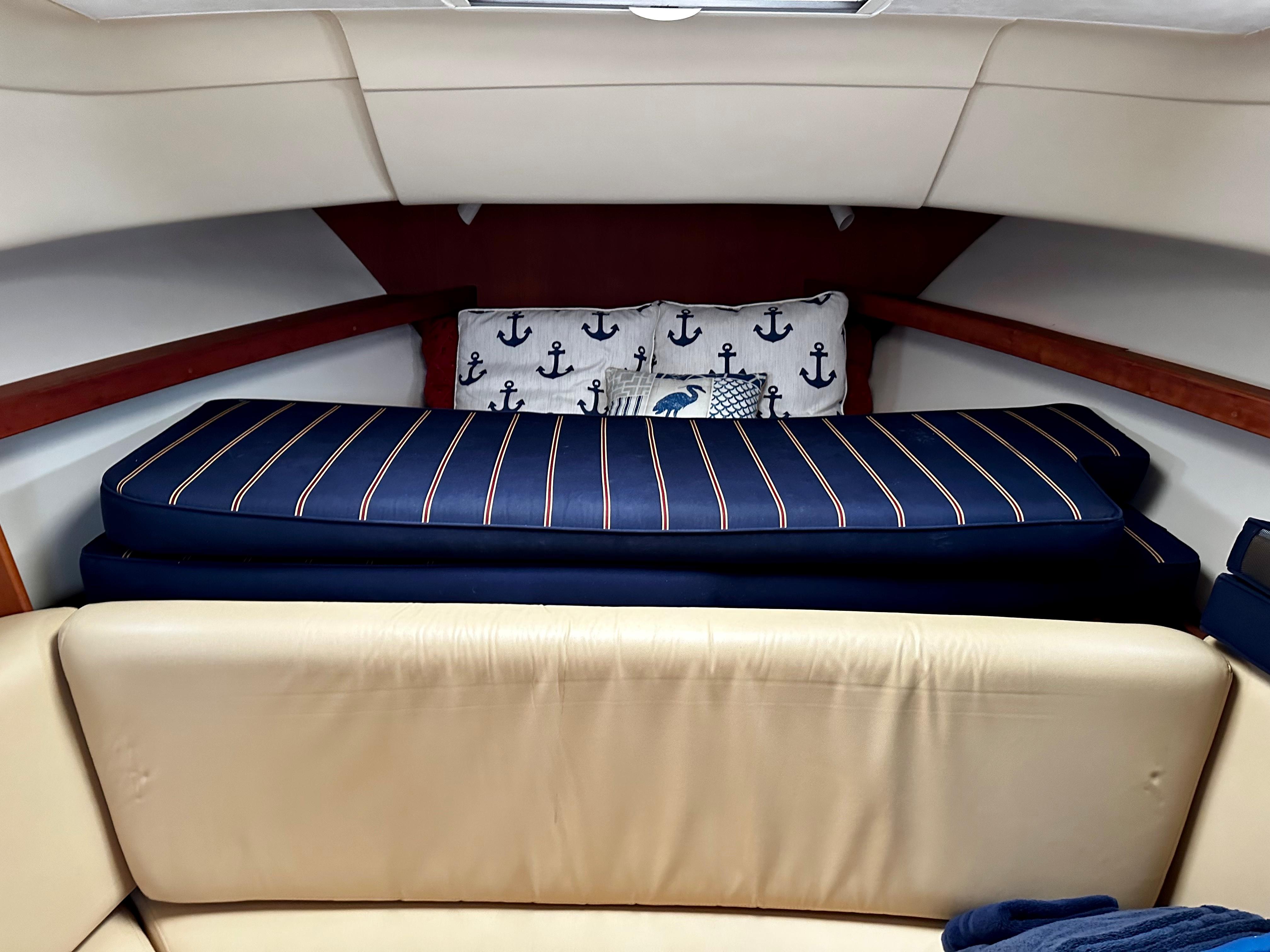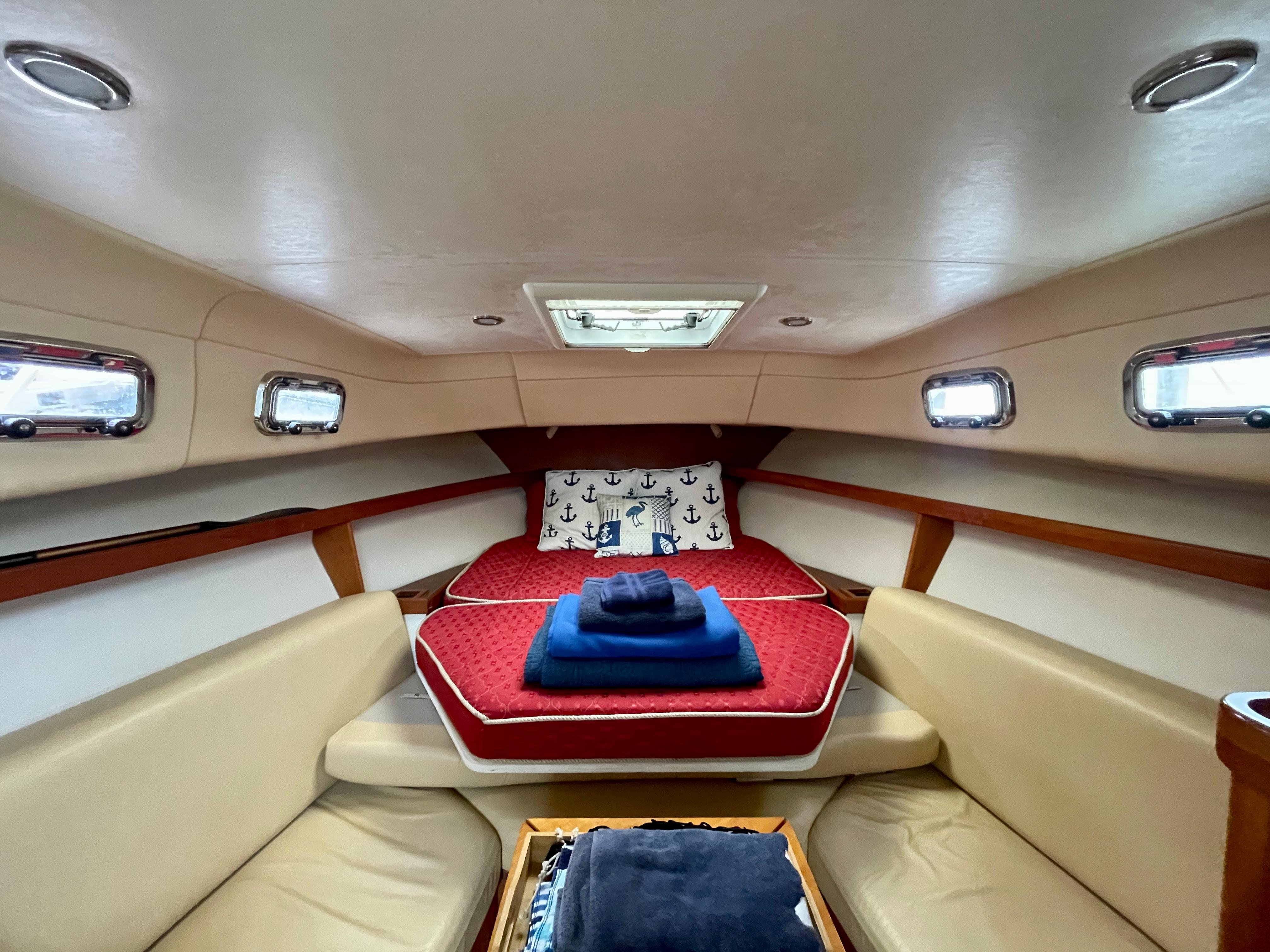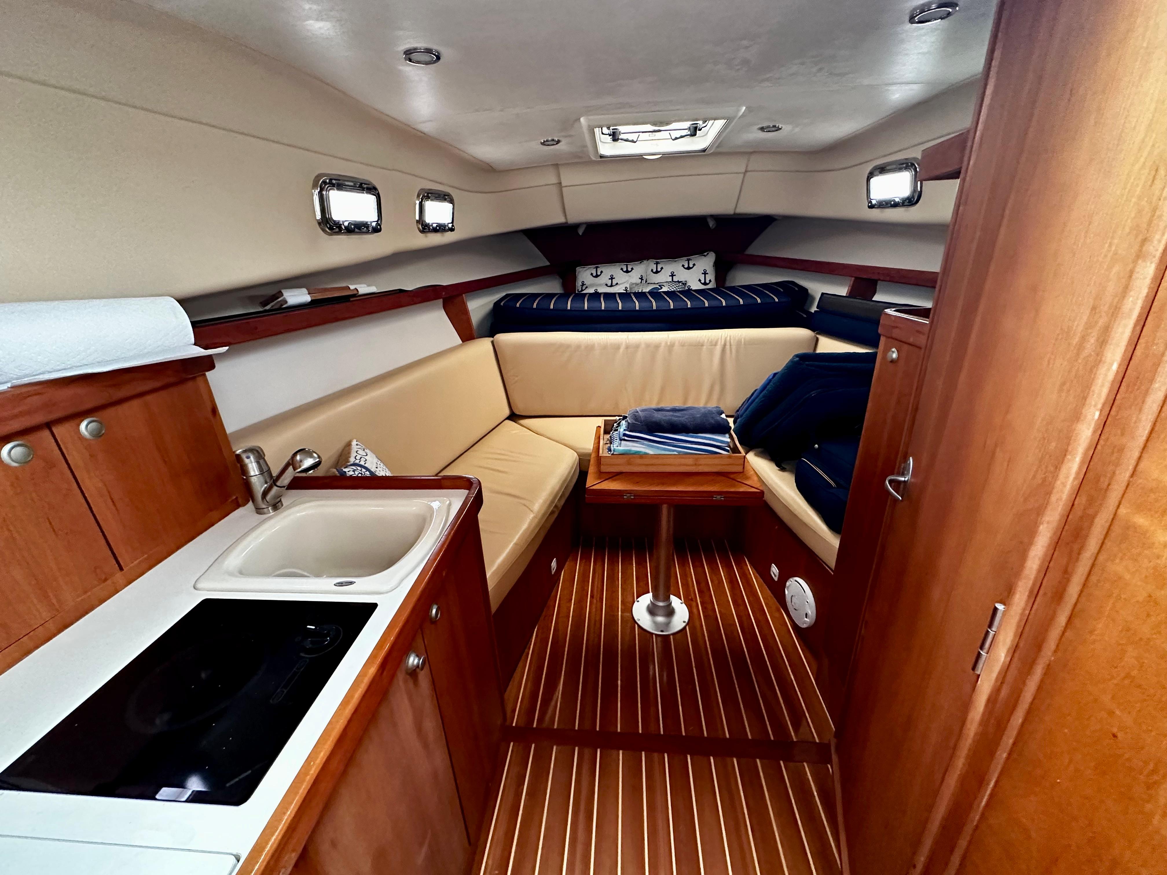 The cabin entrance is easily accessed by a two-step companionway, and to the portside is a linear galley fitted with formica countertop, refrigerator, sink, and cooktop. The cabin is nicely appointed by rich cherry paneling and cherry/ holly flooring. To starboard is an all-fiberglass head with an electric toilet, shower, and ample storage. Forward is an aft-facing U-shaped dinette with a folding leaf removable table. The v-berth is full hull with a slide-out leg section that creates a queen bed.
