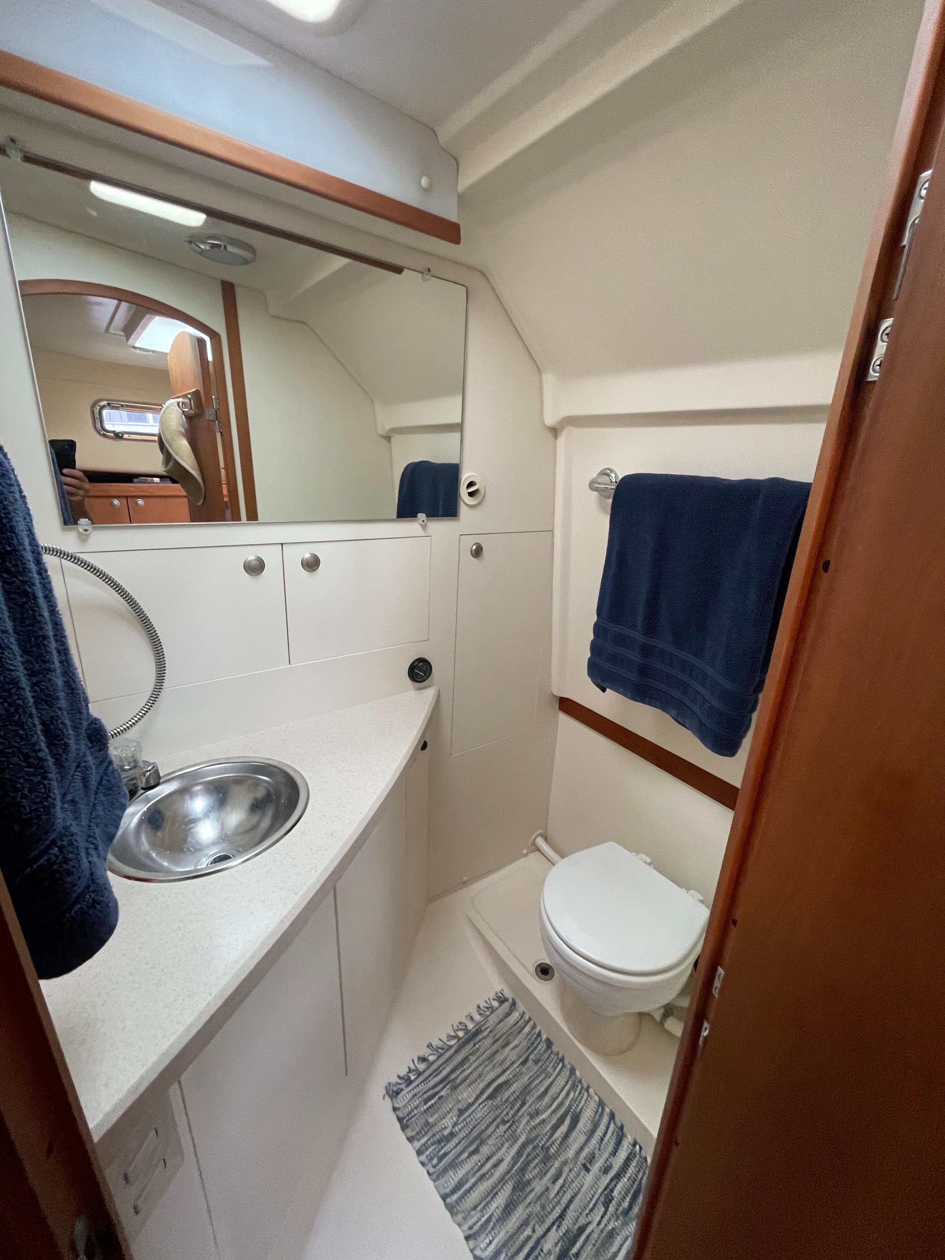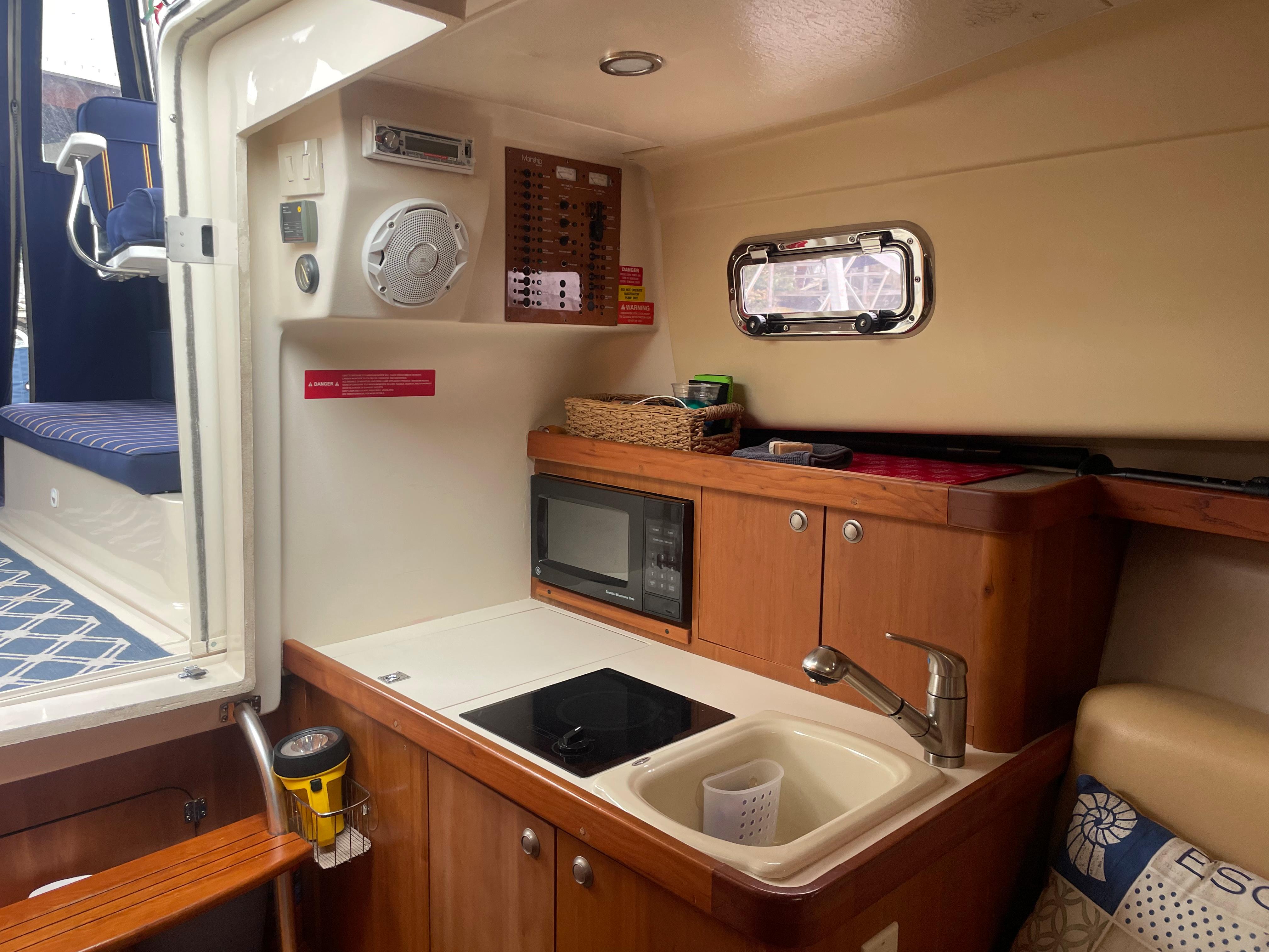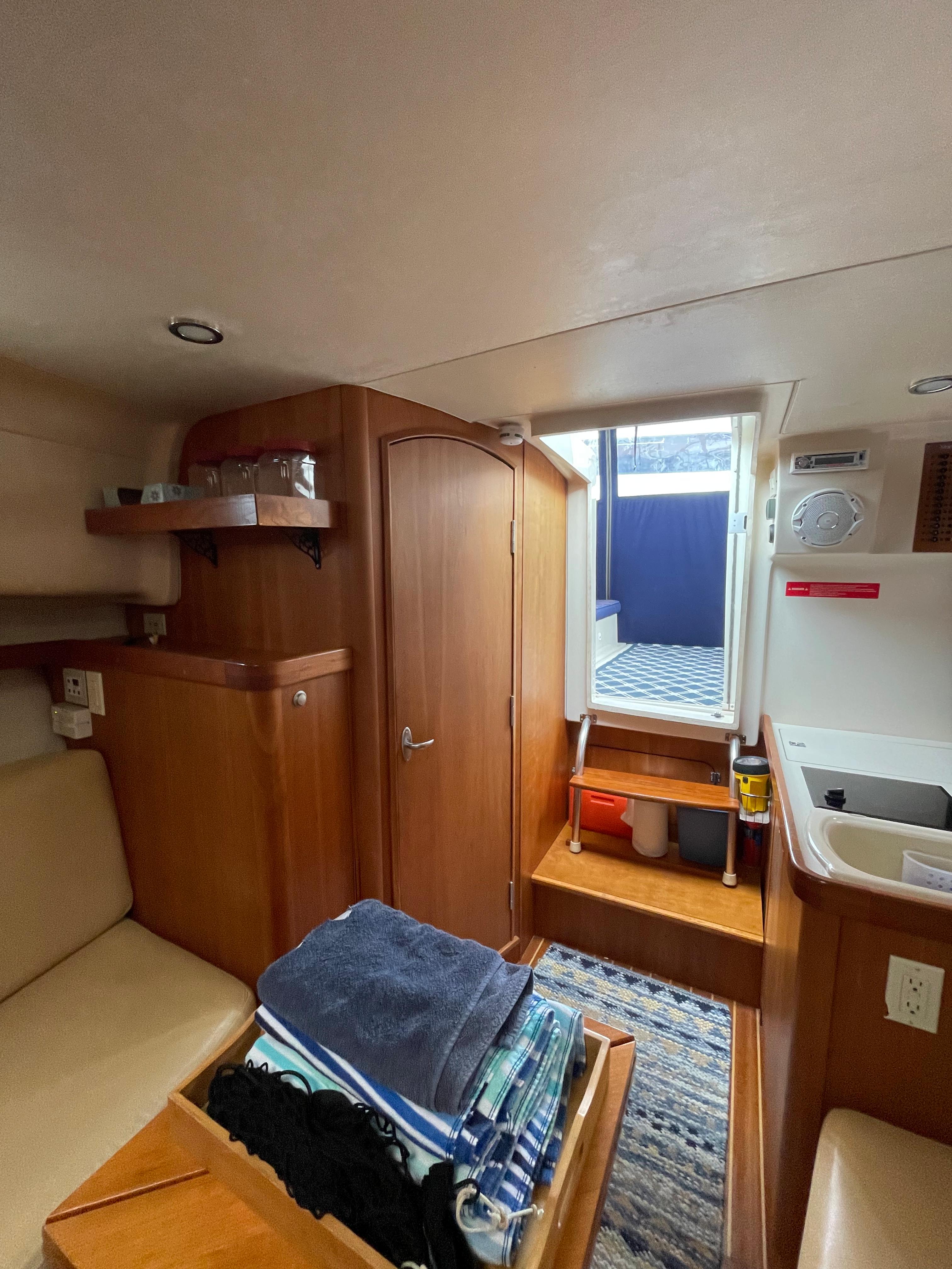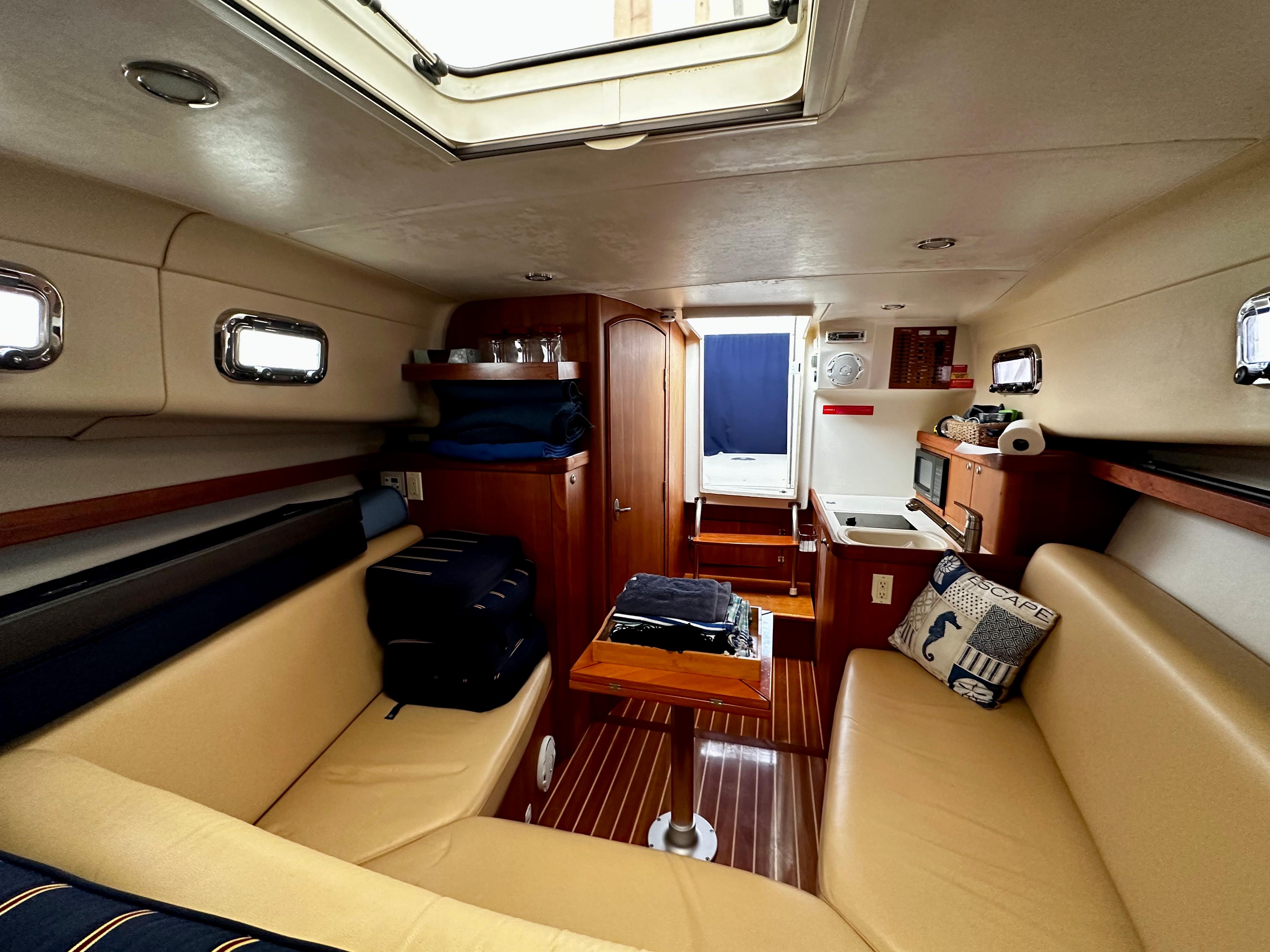 The cabin entrance is easily accessed by a two-step companionway, and to the portside is a linear galley fitted with formica countertop, refrigerator, sink, and cooktop. The cabin is nicely appointed by rich cherry paneling and cherry/ holly flooring. To starboard is an all-fiberglass head with an electric toilet, shower, and ample storage. Forward is an aft-facing U-shaped dinette with a folding leaf removable table. The v-berth is full hull with a slide-out leg section that creates a queen bed.