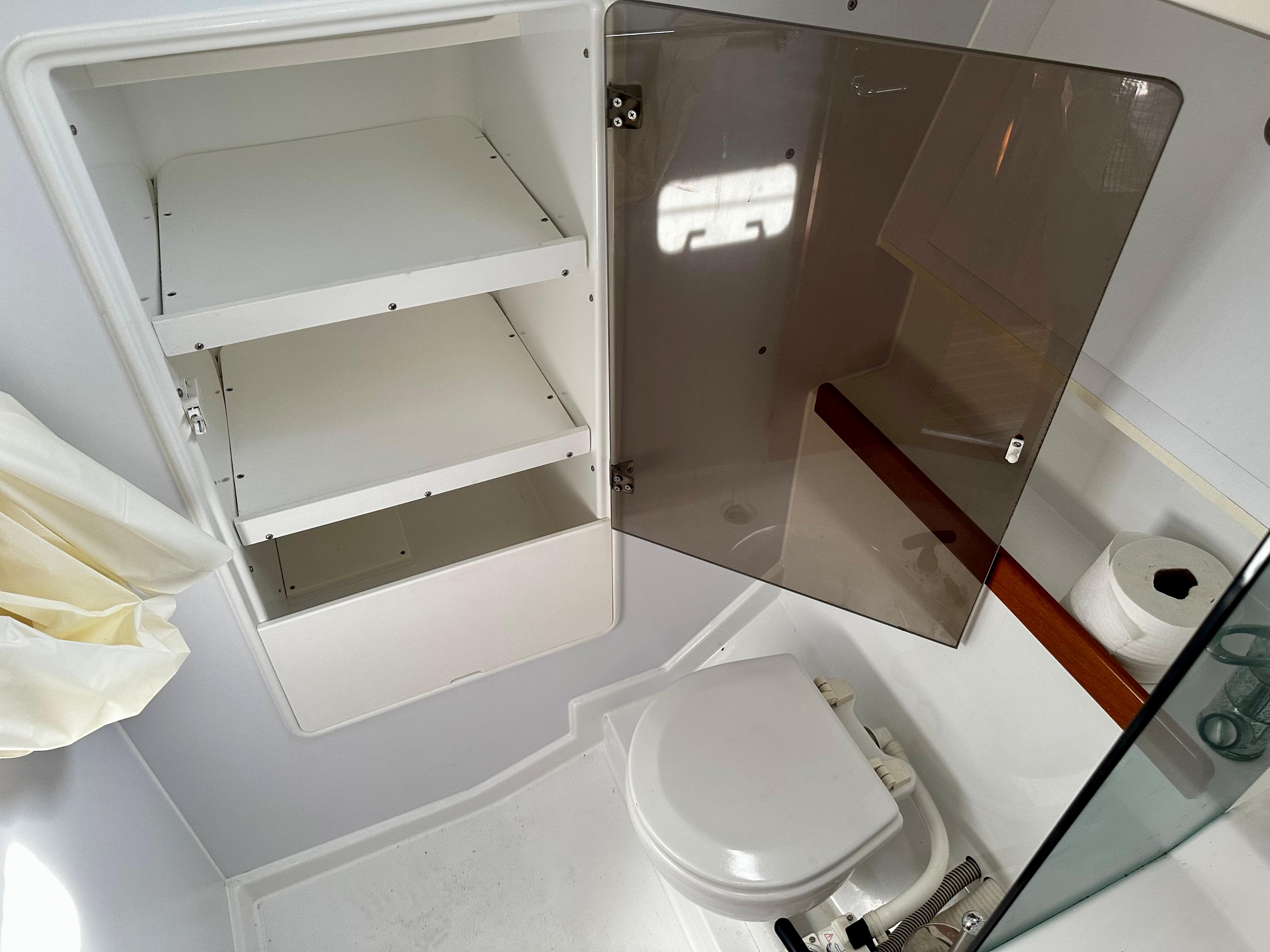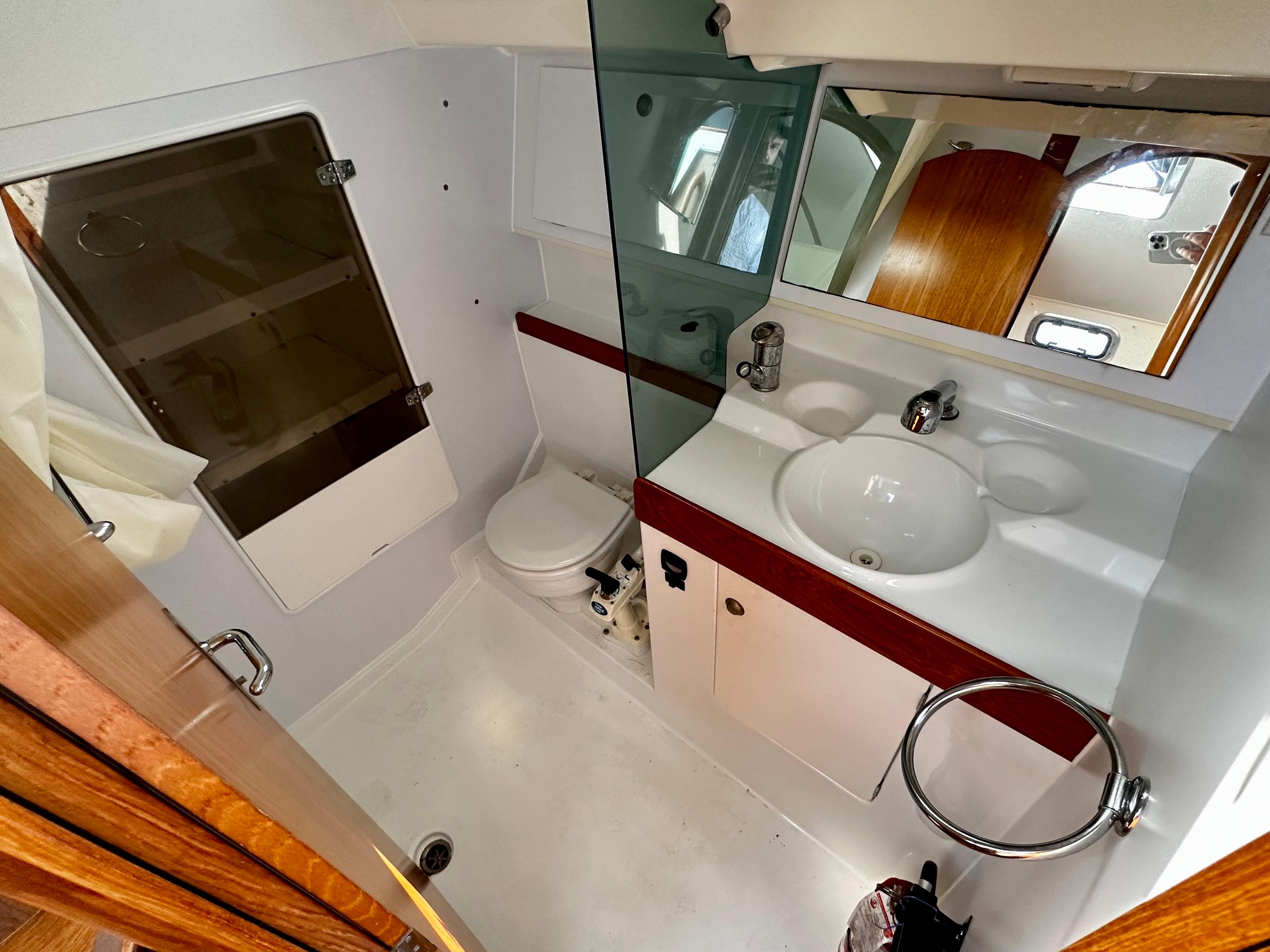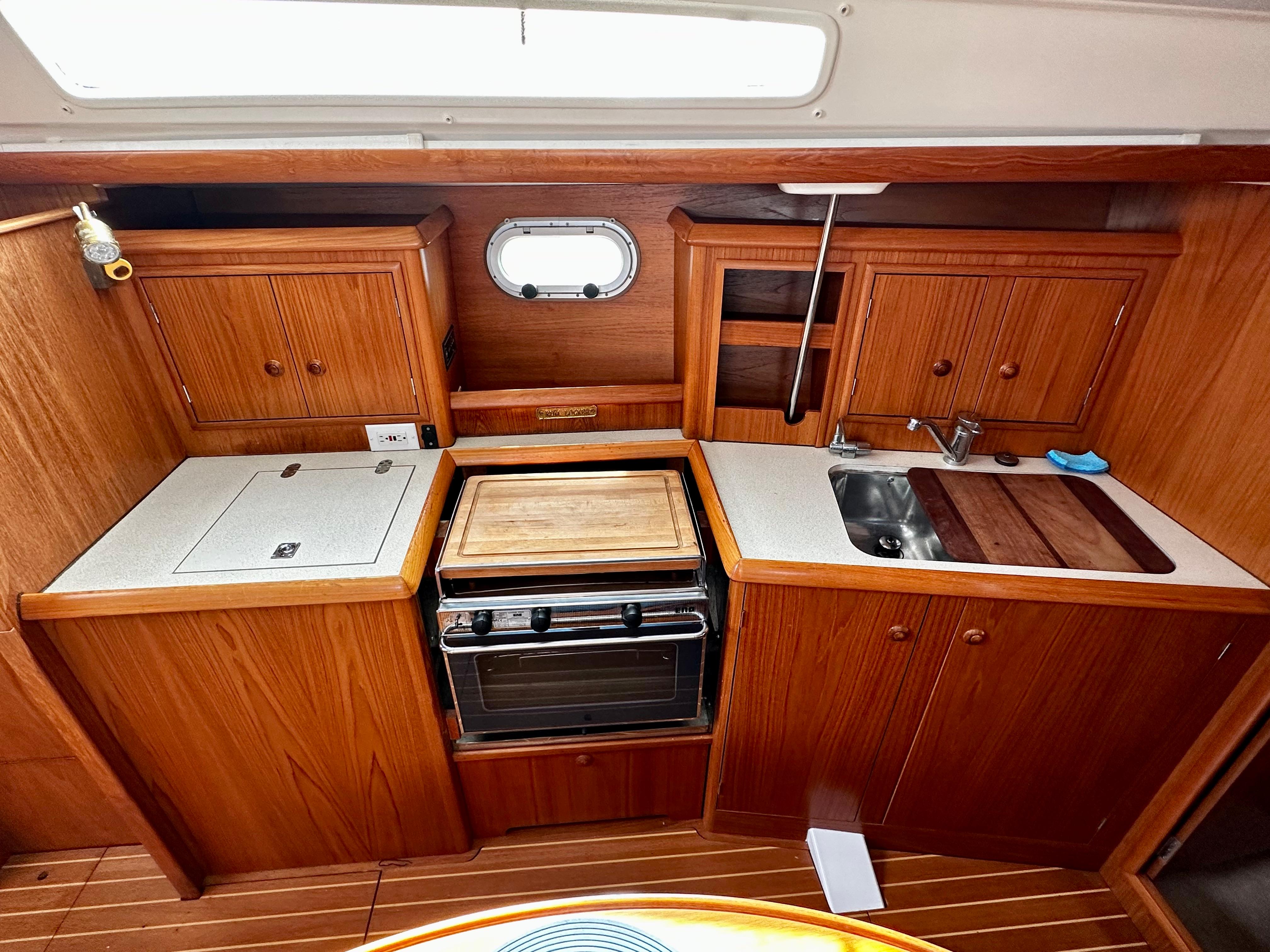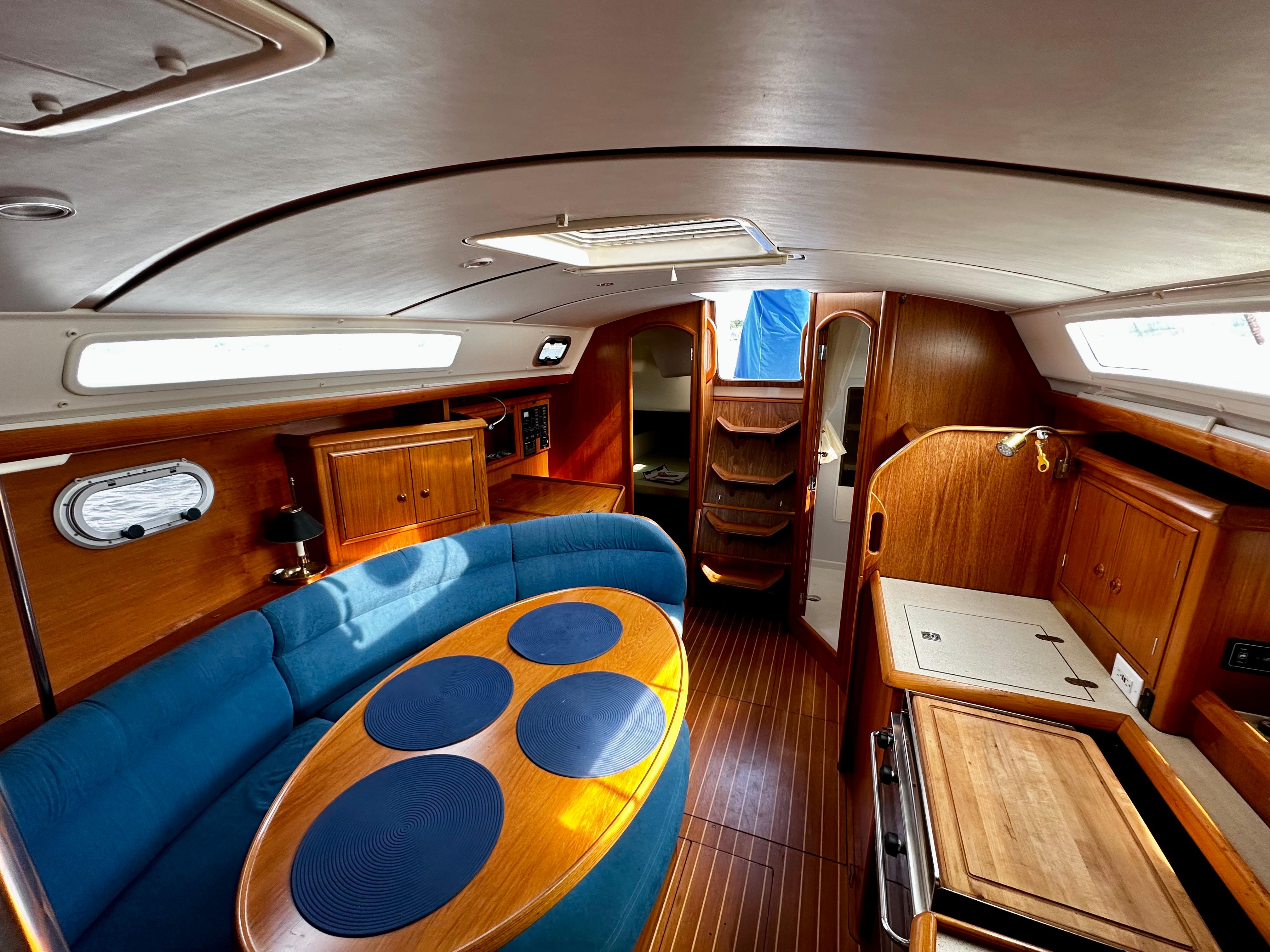 "Next Level" features two spacious cabins with hanging lockers in each, ample storage for gear, and good ventilation and light. The main saloon has a curved dinette to starboard, galley to port, and the head aft of the galley to port. There is storage under the settee and dinette, as well as behind and above them. A teak and holly sole and teak bulkheads give the boat a rich feel inside. The galley is on the port side and includes a 2 burner propane stove with oven, SS sink with hot and cold pressure water, 12v fridge w/freezer, microwave, plenty of storage, and counter space. The head has a manual toilet, molded sink, stall shower, and a large shower storage locker.