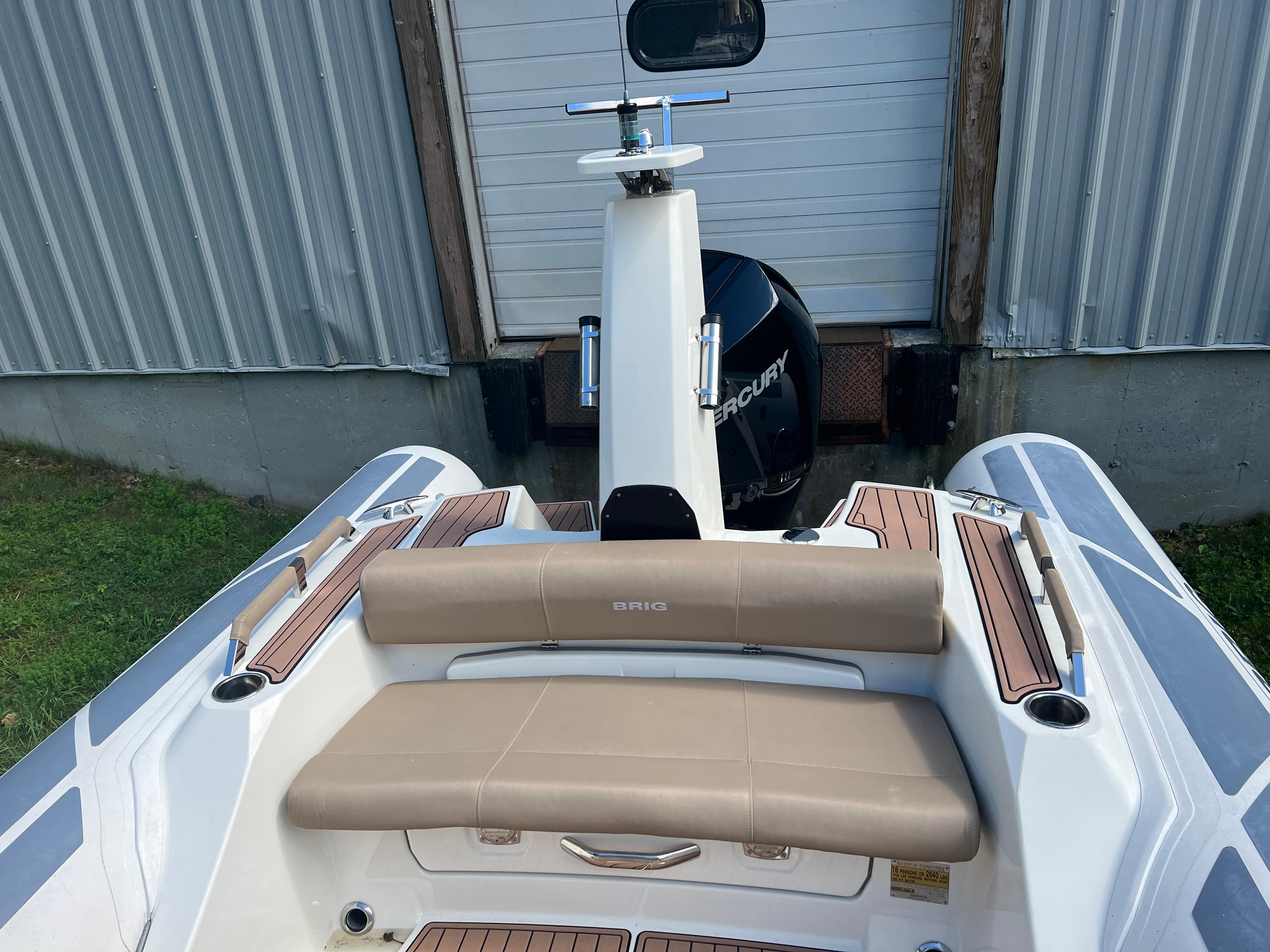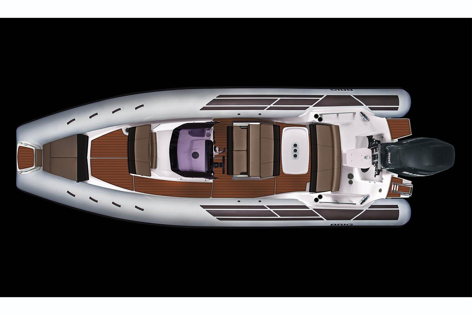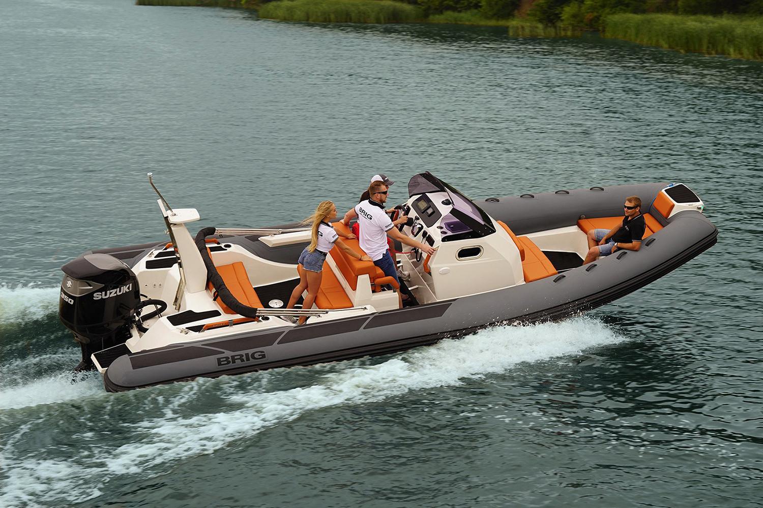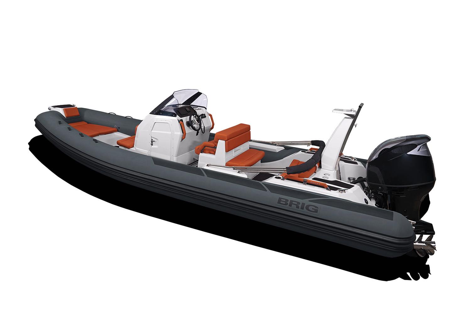With a sleek, modern design and 26 feet of ample space for you and your guests, the Eagle 8 rigid inflatable boat by BRIG is the premier choice for anyone looking for an unforgettable boating experience. Our high-quality boats are made in Europe by people who are experts in their field. The Eagle 8 is a luxurious family cruiser that shows off everything boaters throughout the world have come to love about our durable, great-looking inflatable boats. The Eagle 8 is constructed with a deep-V-hull, which has become a signature of the Eagle series. This large 26ft RIB boat is made with extra-wide tubes, a square bow and an extended waterline to ensure you’ll enjoy a smooth, stable ride whenever you’re aboard. While the Eagle 8 isn’t the biggest RIB boat in our handsome lineup, it is big enough for you and your friends and family to enjoy with ease. It has enough comfortable seating for 11, and it can transport up to 16 adult passengers at once. The Eagle 8 has storage lockers in the front and back, and it’s capable of hauling a payload of as much as 4,270 pounds. With such a versatile, roomy boat, you’ll never have to worry about leaving anyone or anything at the dock. One of the many things that make the Eagle 8 stand out is the boat’s prominent radar arch. This arch is noticeable from a considerable distance, and it gives the sleekly-styled Eagle 8 an unmistakable appearance that’s indicative of all the fun you’ll have every time you hit the water in your inflatable cruiser.