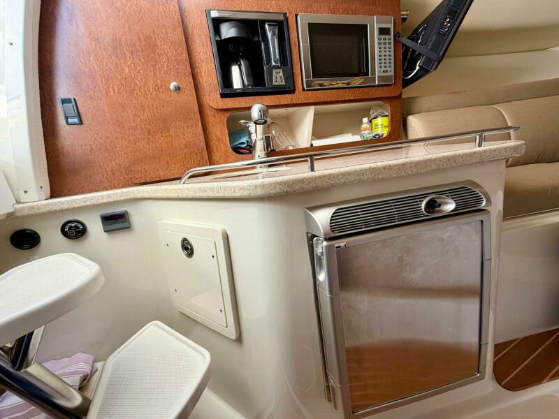 Air-conditioned express cabin with convertible forward dinette/ v-berth, mid-cabin berth, and stand-up head with shower. Compact galley/ wet-bar with refrigerator, sink, microwave, and ample storage. The VX interior delivers true weekender comfort on a fish-first platform. Fit-and-finish is upscale for her class, with practical storage and easy-clean surfaces.