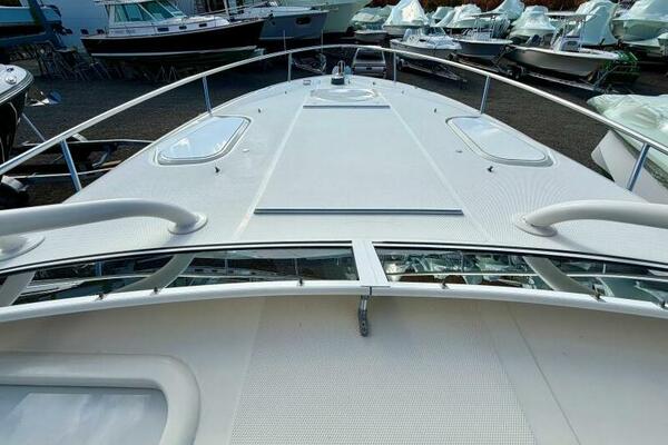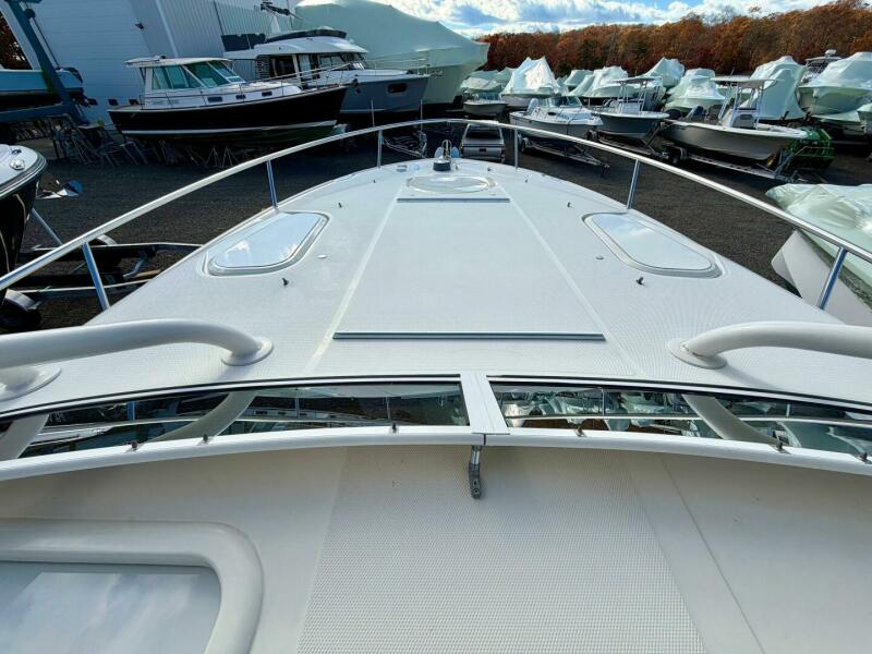 Built with an all-composite structure and hand-laid FRP lamination. Hull and deck are pre-cut bi-axial FRP fabric with woven roving and Kevlar reinforcement. The grid system is Kevlar-reinforced FRP bonded to the hull using methacrylate adhesive. Integral composite transom. All through-hull fittings are bronze below the waterline, and stainless steel above. Flat deck surfaces are white premium gelcoat with contrasting diamond-patterned molded non-skid areas. One-piece 14” stainless steel bow rail tapers at midship. Large FRP hardtop with painted non-skid top on 3” welded tube legs (powder-coated white). Reinforcing hardtop bars curve outboard, giving unobstructed visibility from the helm.