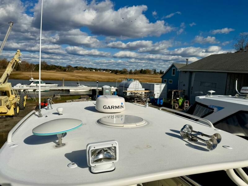 - ICOM flush-mounted VHF with a 6’ Shakespeare antenna on hardtop