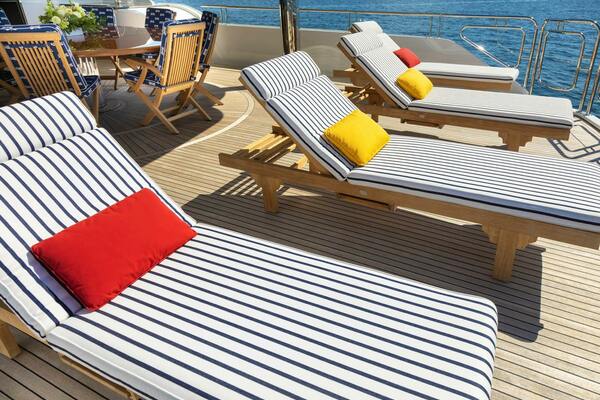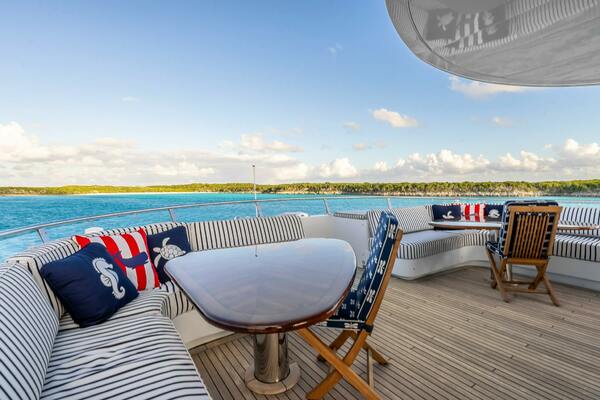Boarding CALLIOPE has been made easy by the 20’ Bezenzoni electric/hydraulic passarelle or the custom-built tide ride ladder either midship or via the aft deck. The main aft deck has plenty of seating area at the teak table and the wrap around bar, providing a good place to view the drop down 32” HD TV.