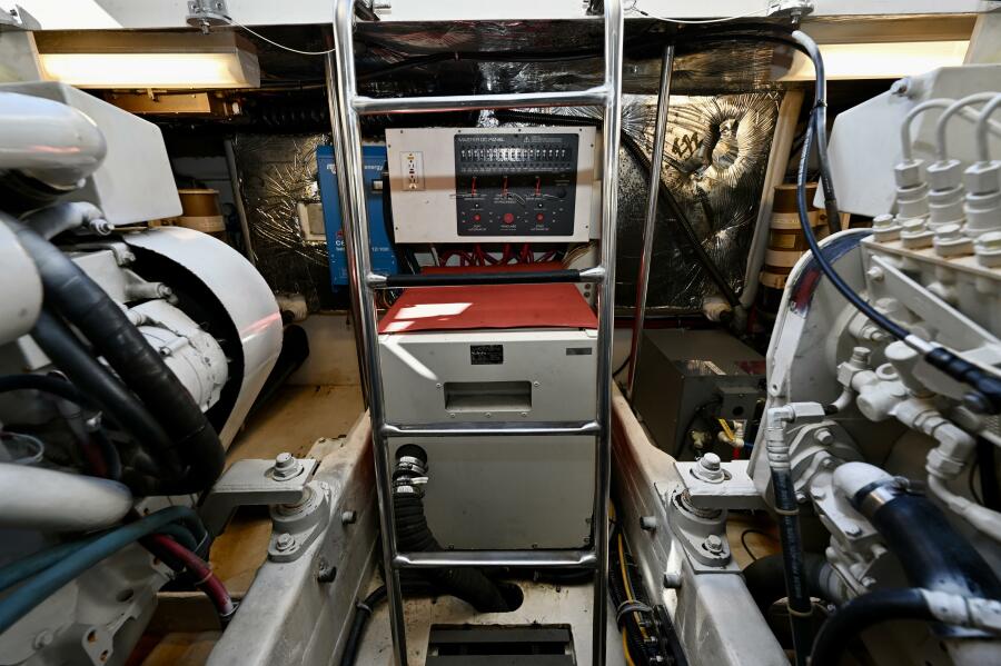 The engine compartment is impressively organized, cleanly finished, and sound-insulated to minimize noise and vibration throughout the cabin. Twin Cummins 6CTA 8.3-M Diamond Series 450hp diesel engines are mounted on heavy-duty stringers, offering reliable performance and efficient cruising. The Mase generator, replaced in 2021, is positioned for easy service access.